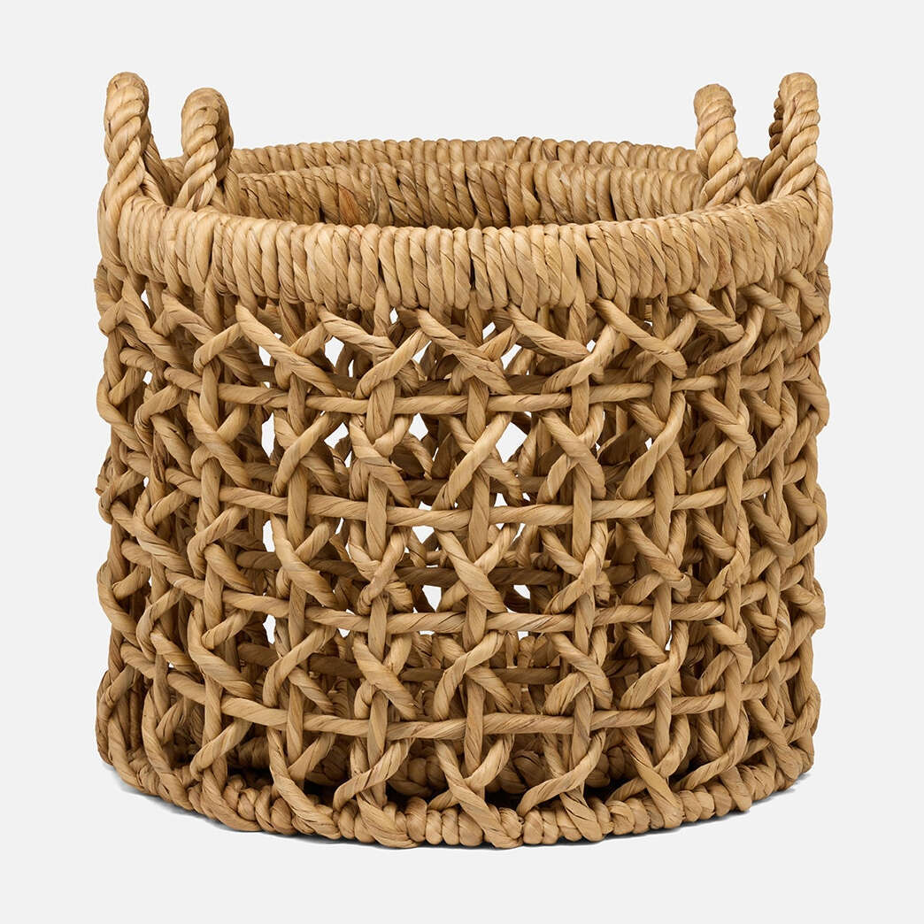 Whether used for storage or as decor, the Catania nested baskets are welcome additions to any space. Woven from water hyacinth, each basket is rectangularly tapered with handles and sold as a set of two.