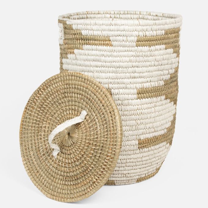 Round hamper with symmetrical white design on natural mendong and raffia.