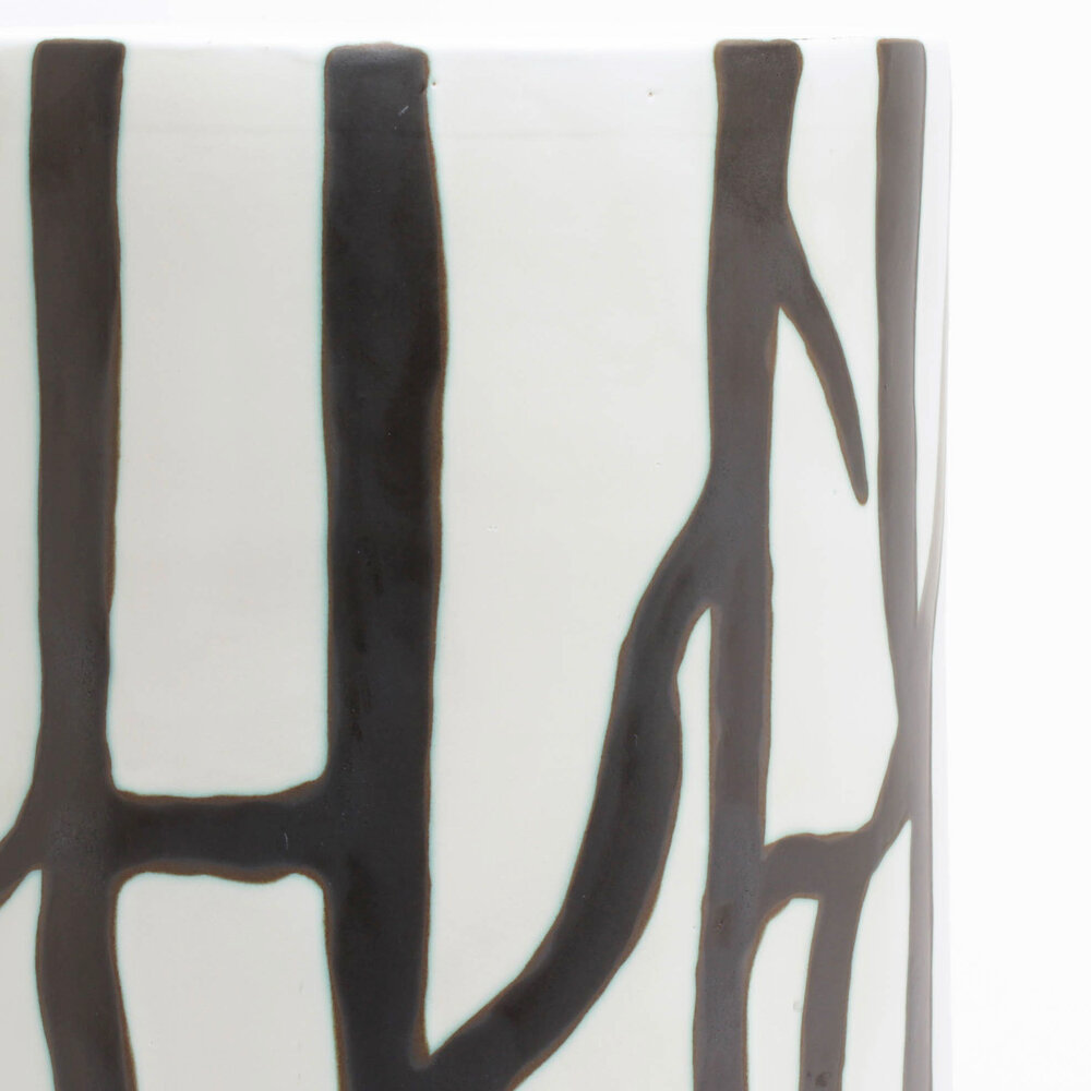Graphic black-and-white striped ceramic umbrella stand in two sizes. Due to the nature of glaze on ceramic, edges of black may show color bleed with an organic blue-green halo, giving each piece a unique artisan's touch.