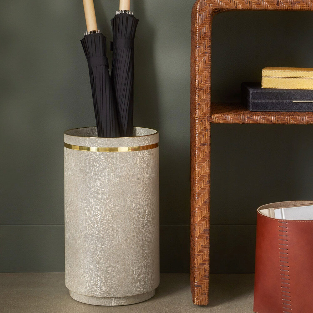 Luxury umbrella stand in our signature neutral faux shagreen finish complete with brass gold detailing. A protective bottom tray insert is included.