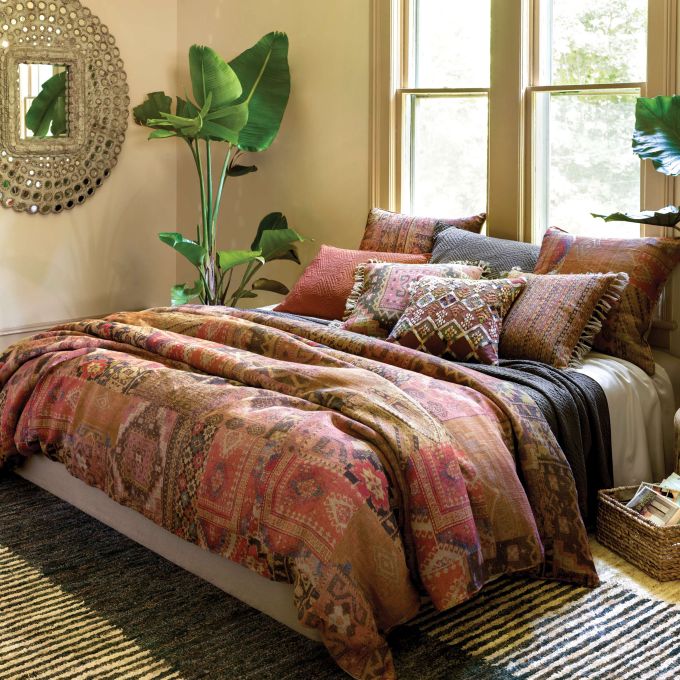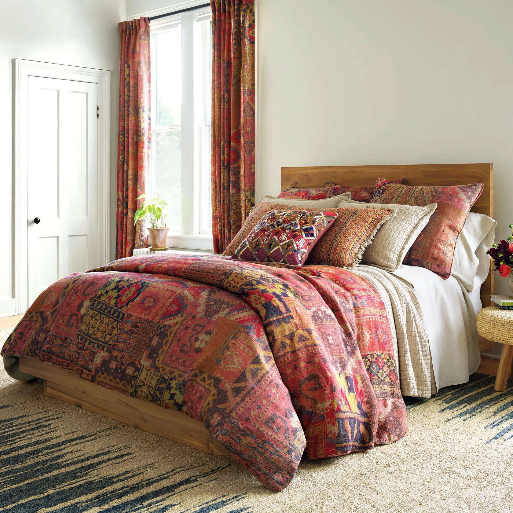 Add a pop of Eastern flair to any bed with this kilim-inspired linen sham. Featuring a colorful patchwork print in shades of java, brick, blue, and terra-cotta, this collection mixes effortlessly with our Laundered Cotton throws, Linen Mesh coordinates, and Anatolia decorative pillows and throw.