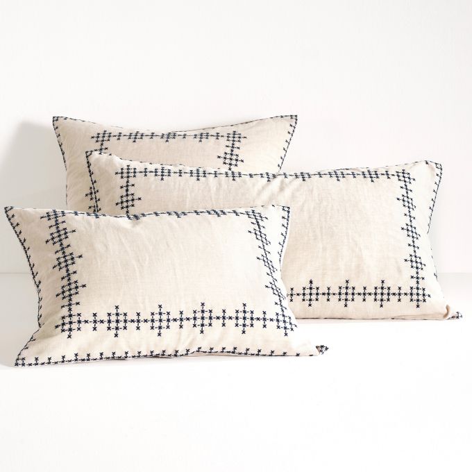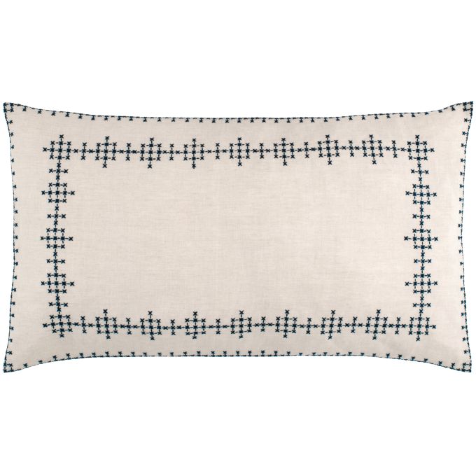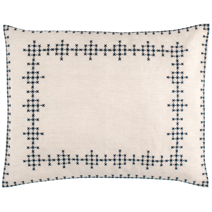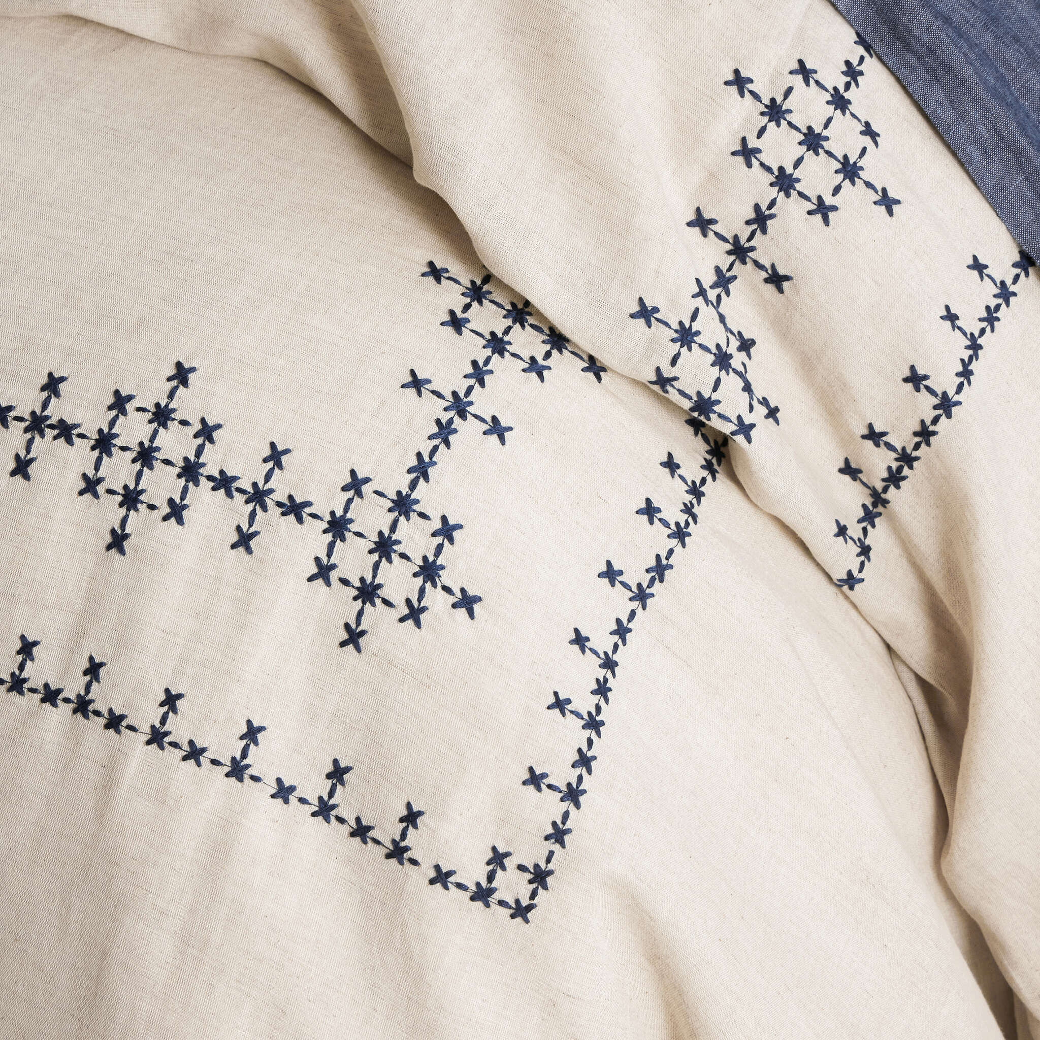 Single side embroidery. Hidden button closure. Inside corner ties to help keep duvet insert secure.
