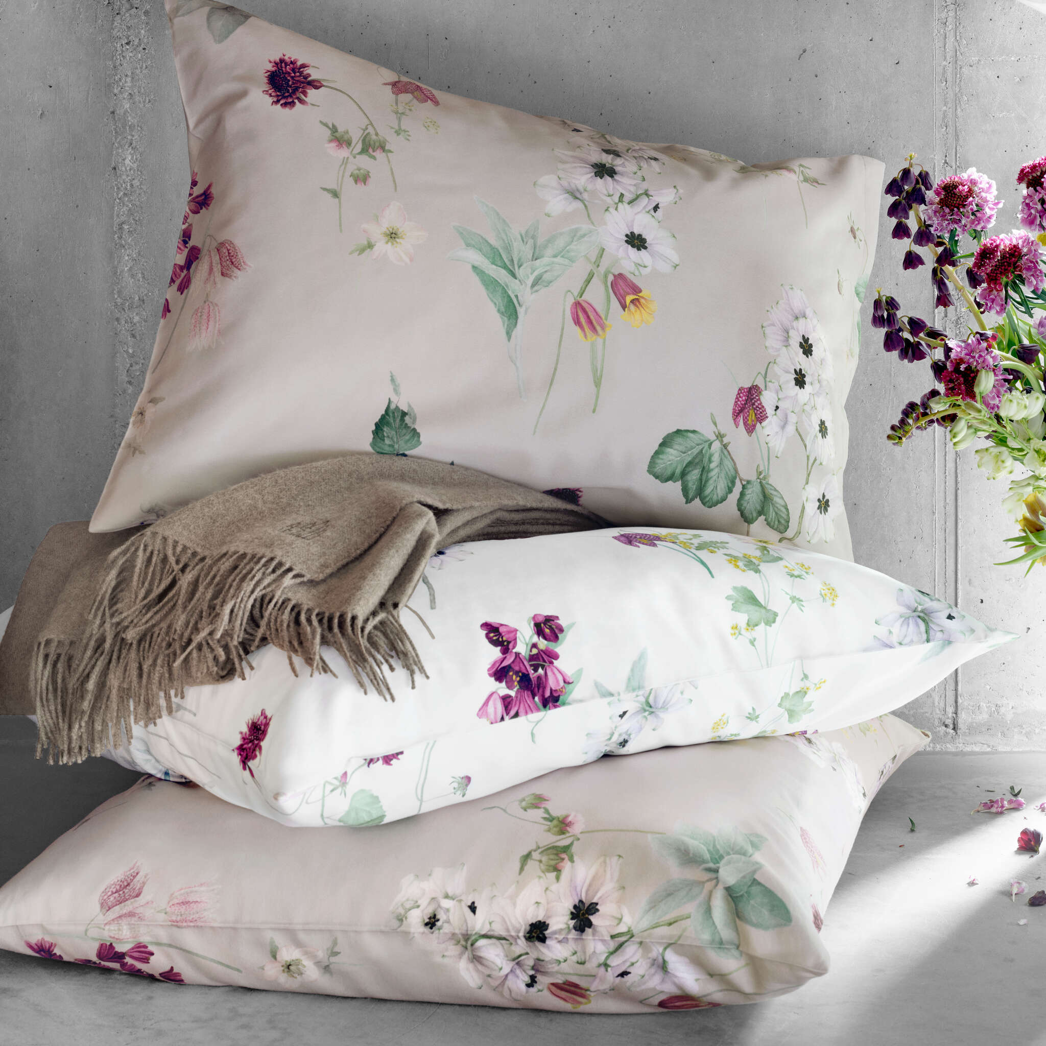 The bedding design Freya presents a delicate potpourri of iridescent green tones together with lilac and beige-pink flowers. Colorfully mixed from lady's mantle, delphinium, Christmas roses, bell and checkerboard flowers and skillfully complemented with sage, beech and birch leaves Freya inspires for a sprawling bouquet.