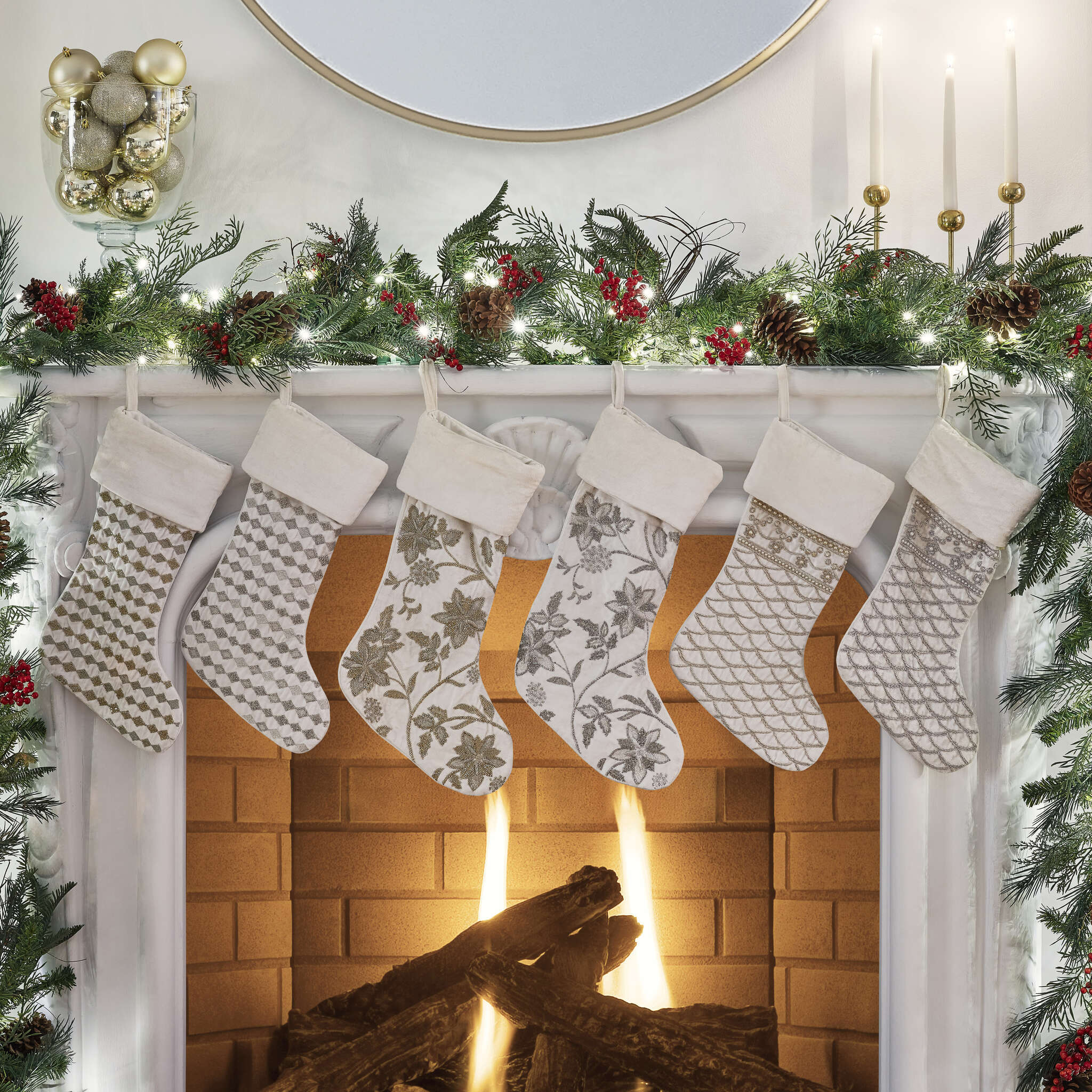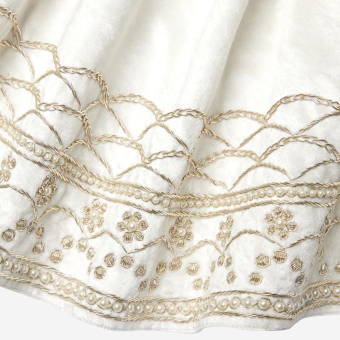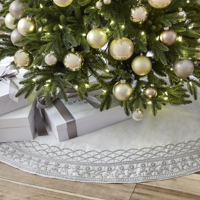 This stocking and tree skirt collection dazzles with scalloped beadwork and metallic embroidery on a snowy velvet base - while the solid cuff can be personalized with a monogram.
