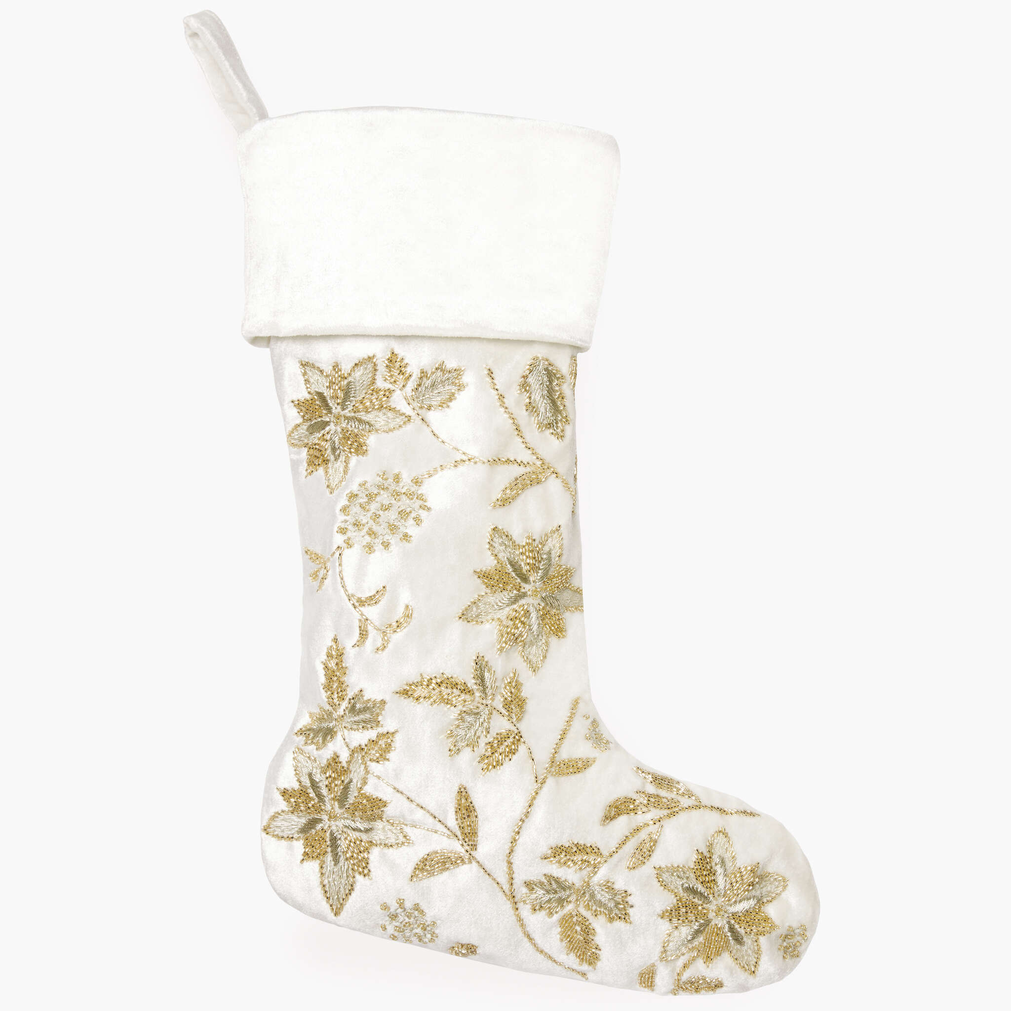 Embroidered all-over with poinsettias in metallic gold or silver thread, the Allegria stocking embodies classic holiday elegance.