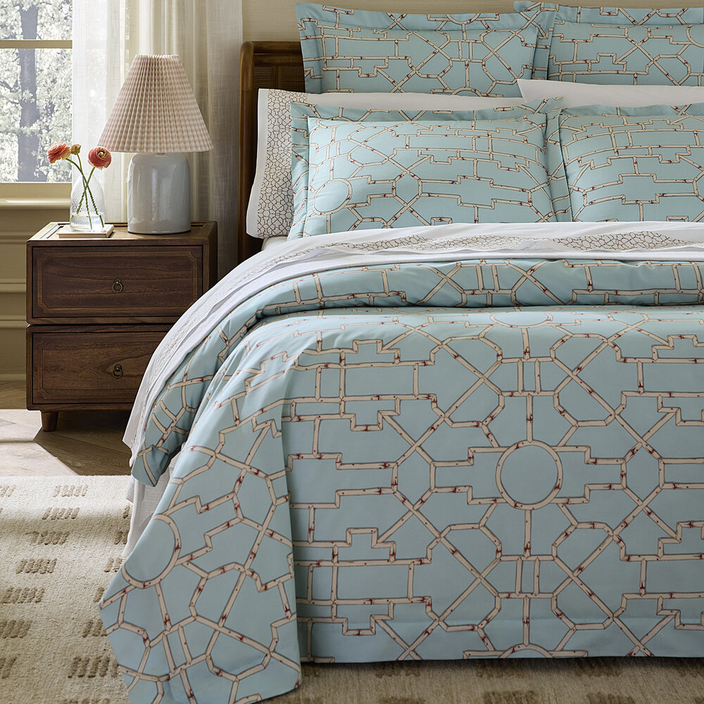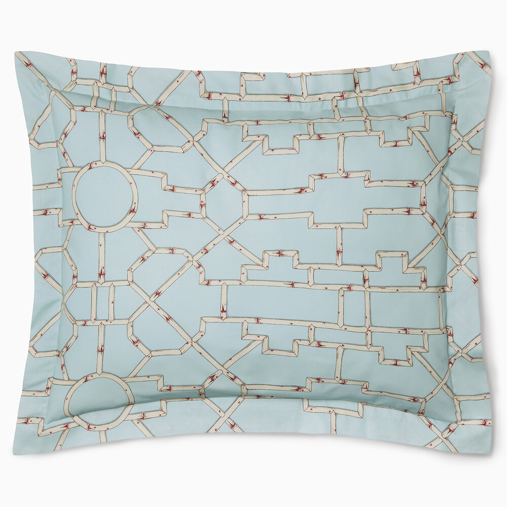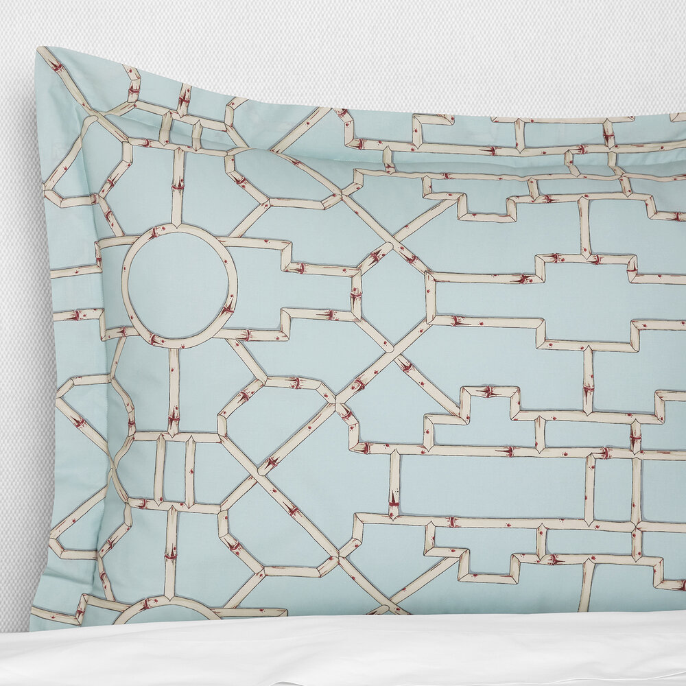 Inspired by the elegance of bamboo lattice, Baldwin Bamboo brings a spirited graphic sensibility to the bed through its striking printed percale. Woven in Italy from 100% long-staple cotton, this collection, created in collaboration with Scalamandré, captures the interplay of structure and organic form in shades of cream, red, and aqua — drawing from the rich tradition of Asian decorative motifs.