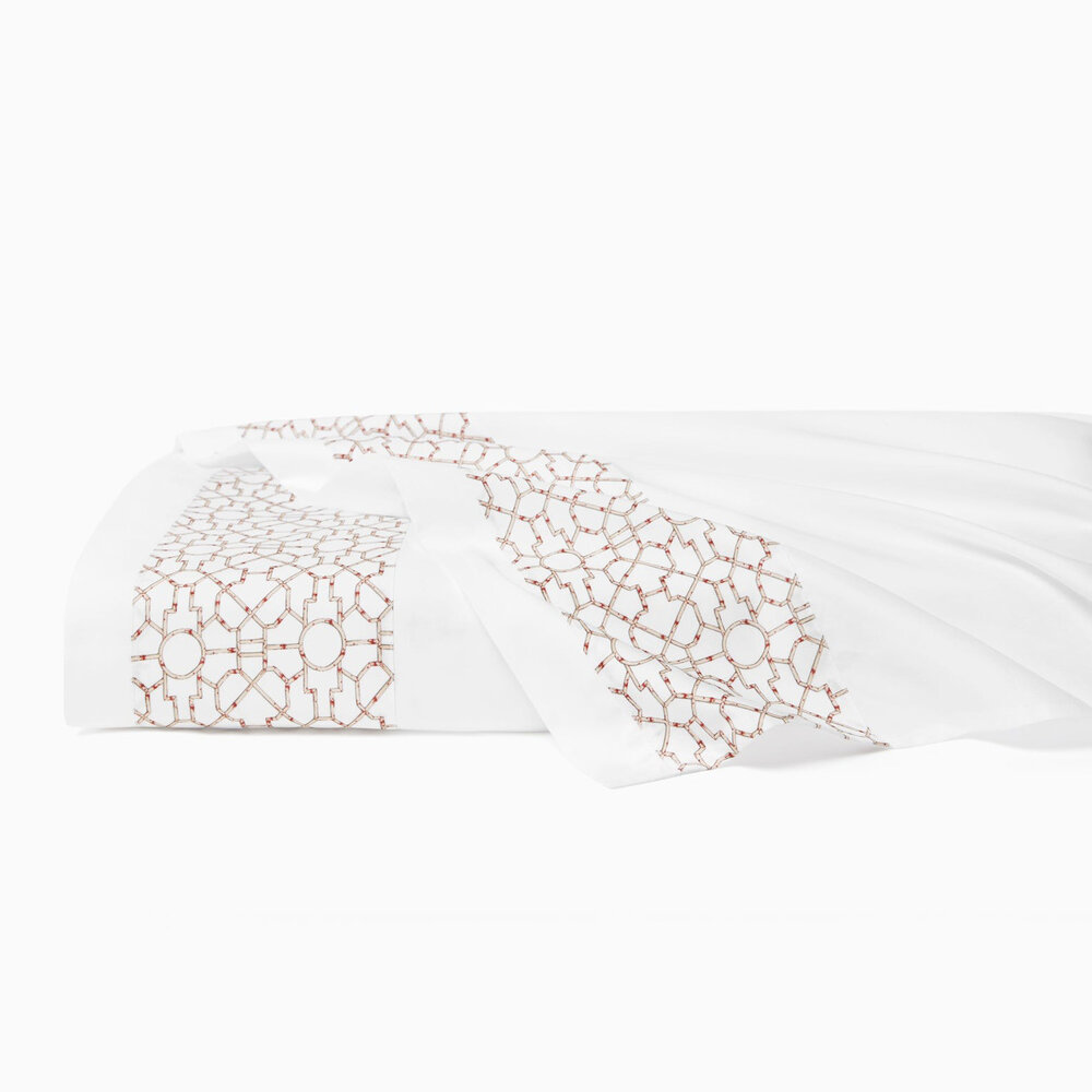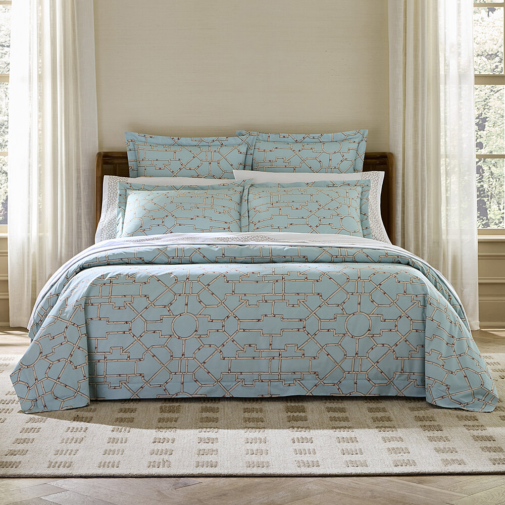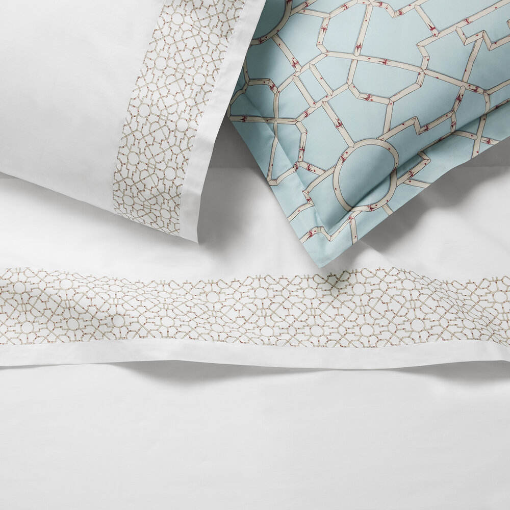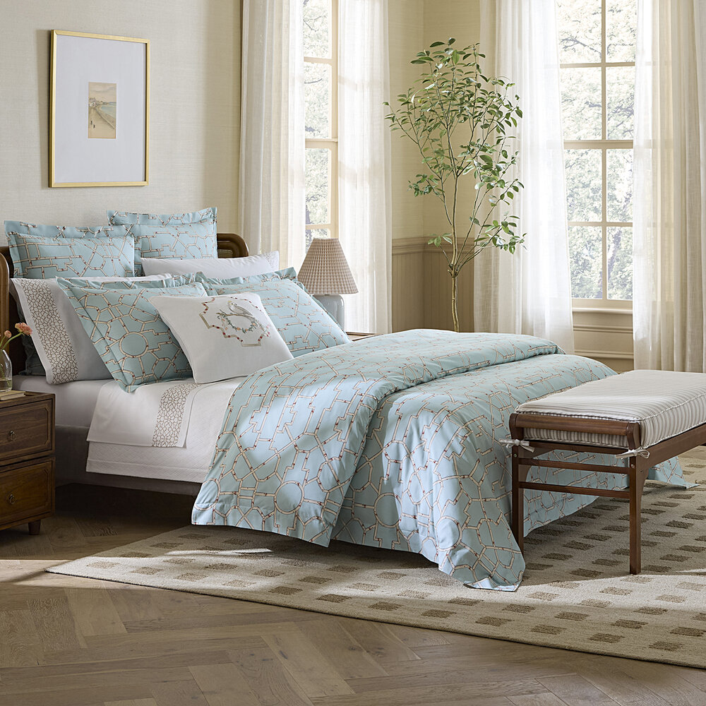 Inspired by the elegance of bamboo lattice, Baldwin Bamboo brings a spirited graphic sensibility to the bed through its striking printed percale. Woven in Italy from 100% long-staple cotton, this collection, created in collaboration with Scalamandré, captures the interplay of structure and organic form in shades of cream, red, and aqua — drawing from the rich tradition of Asian decorative motifs.