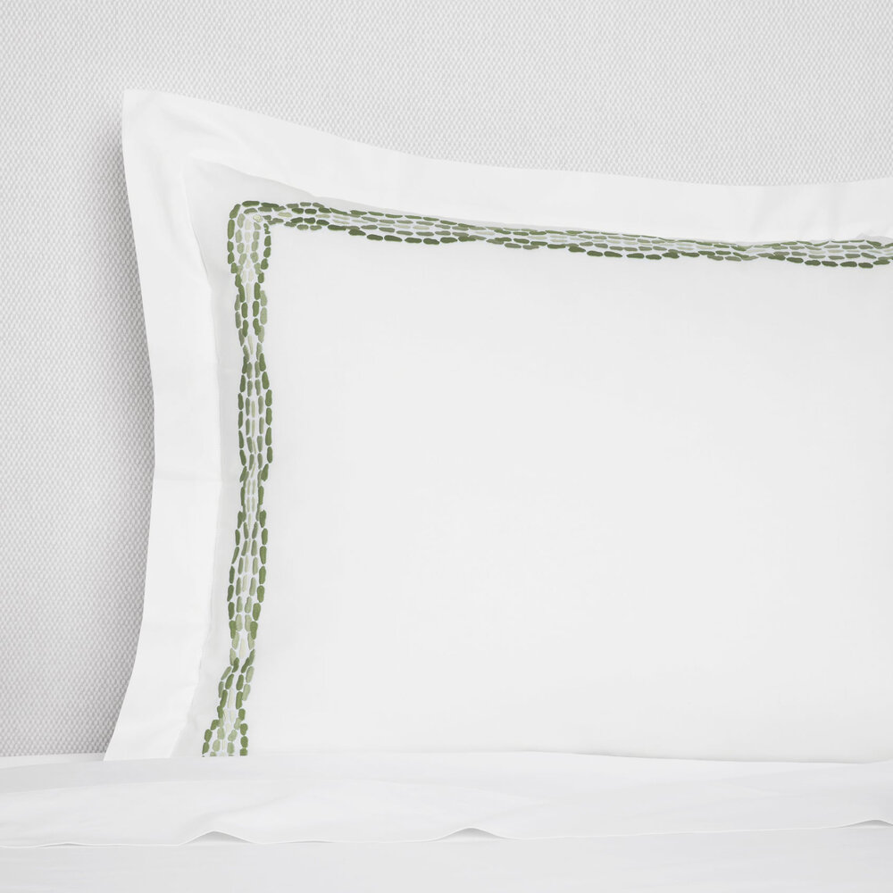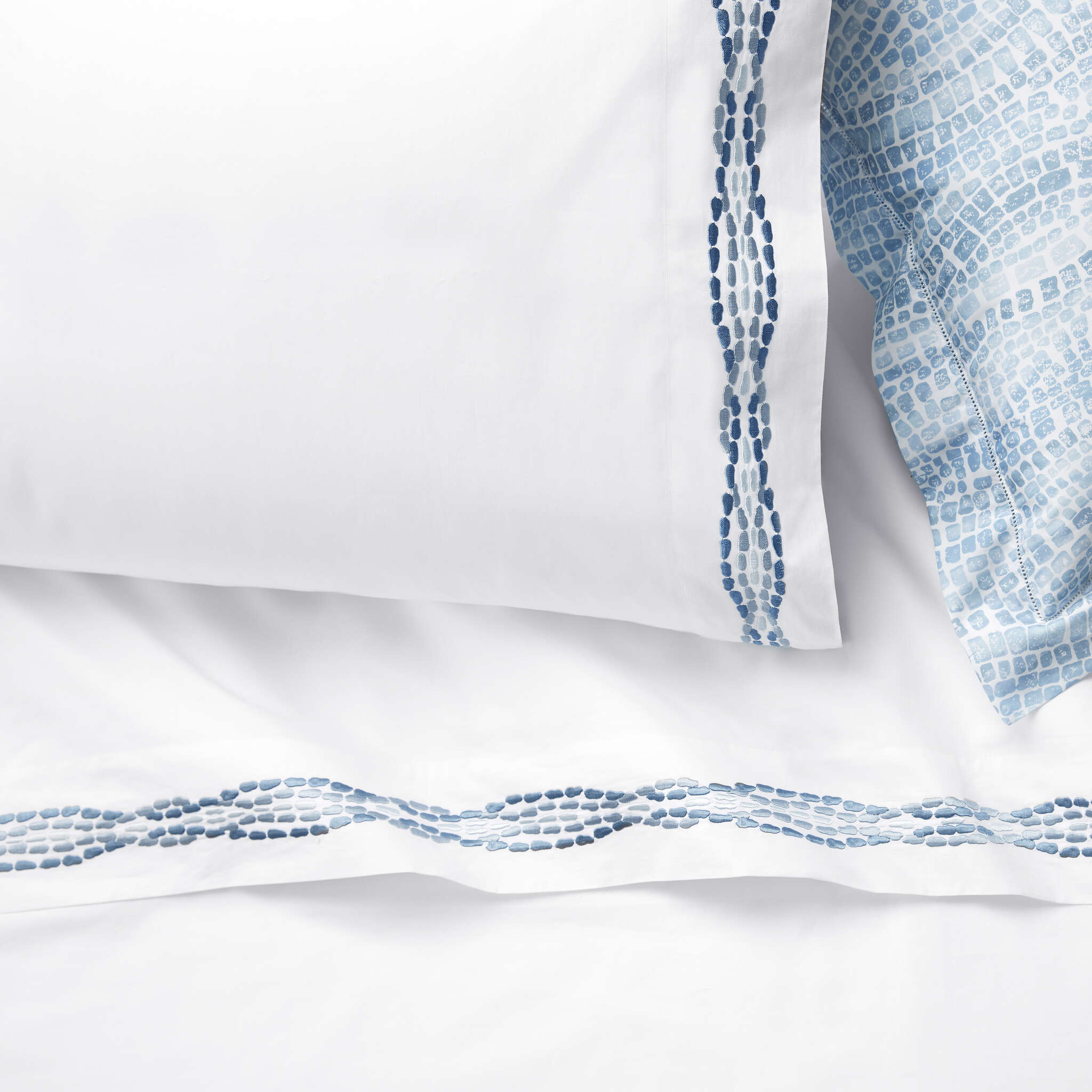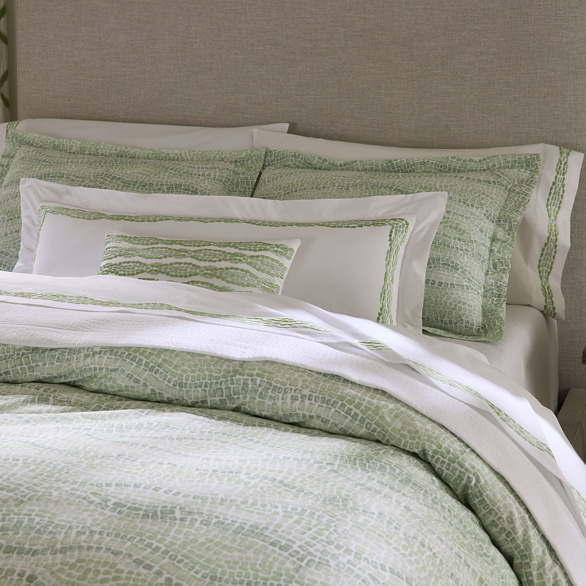 Originally designed in 1960 and inspired by the Greek historical city of Mystras, this iconic Cobblestones motif reflects Scalamandré’s commitment to timeless elegance. Once rendered in single-color printed cotton, Cobblestones has now been reimagined with a fresh, transitional sensibility for today’s design aesthetics. This updated version marries the pattern’s rich Byzantine roots with a contemporary softness: a watercolor wash effect brings depth and nuance to the print design, while the embroidered elements of this Italian-crafted bedding collection lend added dimension and tactile luxury. Cobblestones offers the perfect balance of classical inspiration and modern refinement, inviting a piece of Greece’s storied heritage into your home.