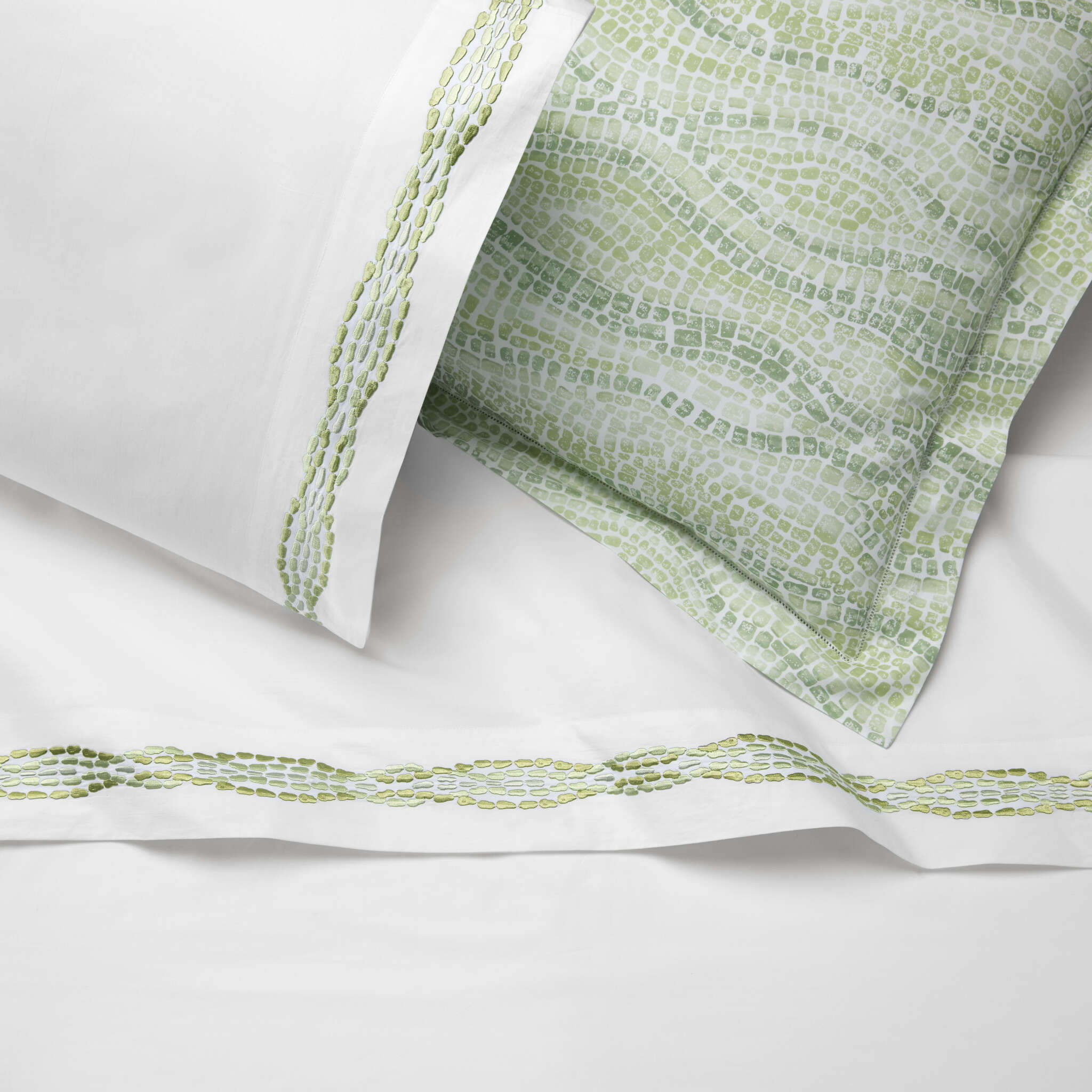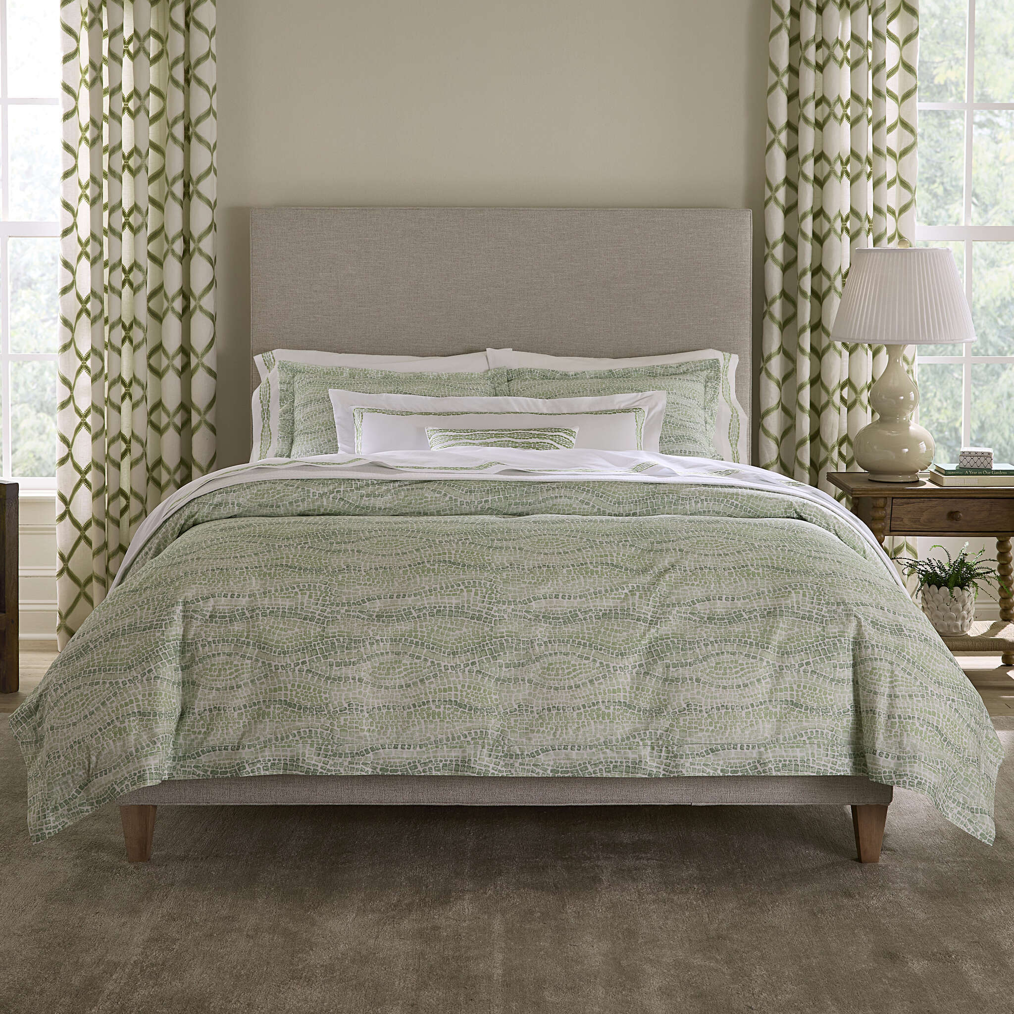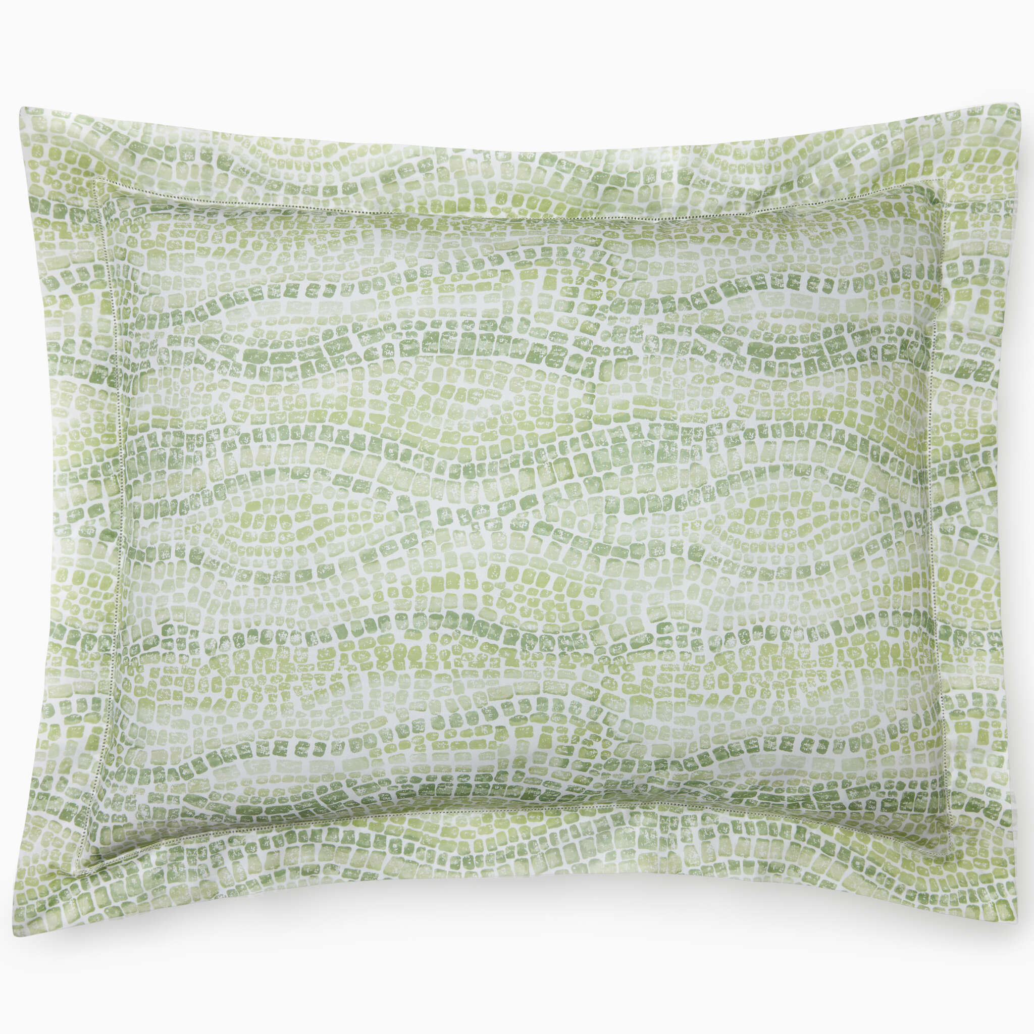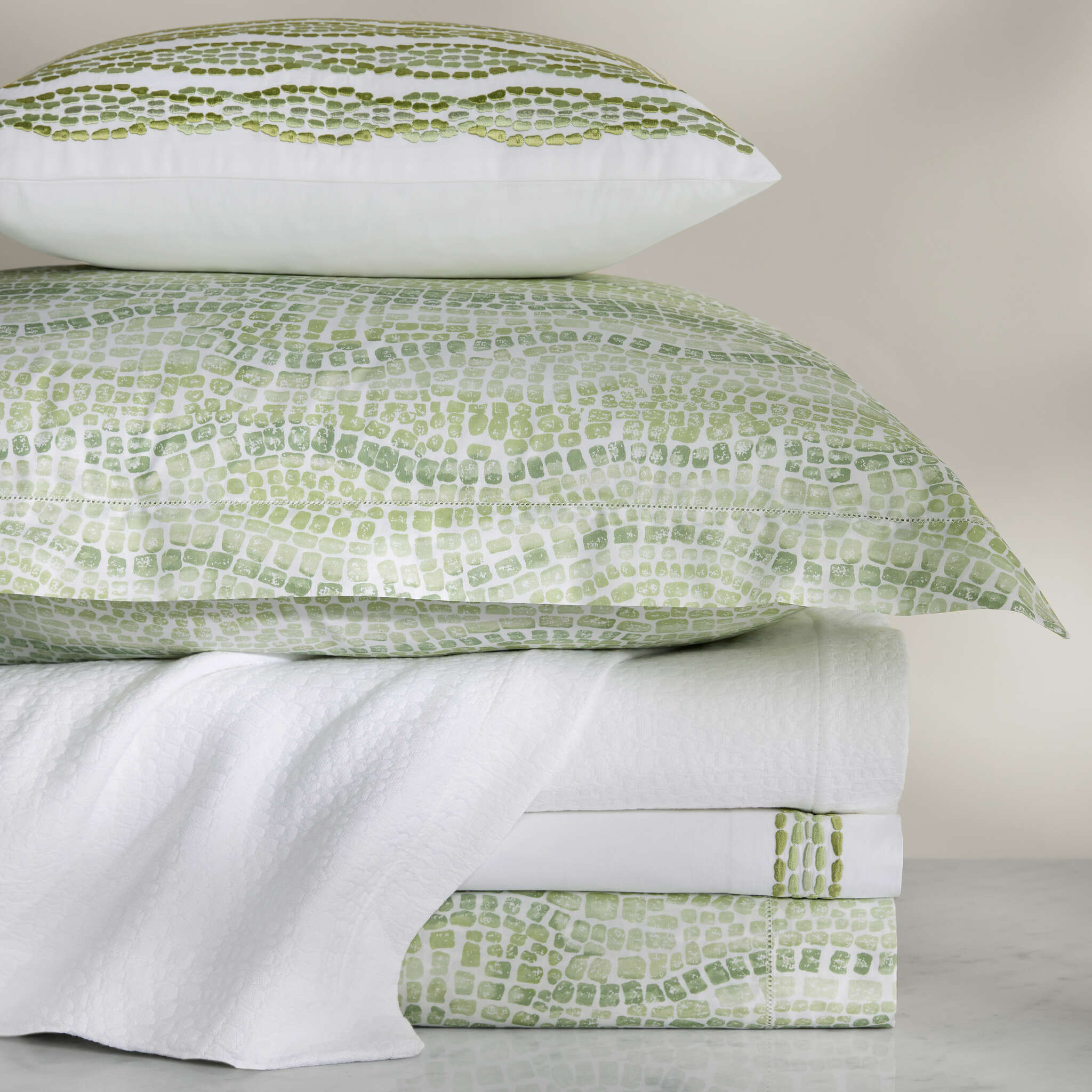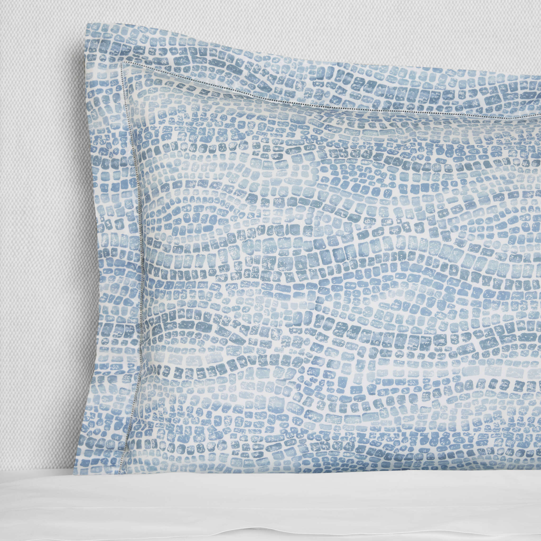 Originally designed in 1960 and inspired by the Greek historical city of Mystras, this iconic Cobblestones motif reflects Scalamandré’s commitment to timeless elegance. Once rendered in single-color printed cotton, Cobblestones has now been reimagined with a fresh, transitional sensibility for today’s design aesthetics. This updated version marries the pattern’s rich Byzantine roots with a contemporary softness: a watercolor wash effect brings depth and nuance to the print design, while the embroidered elements of this Italian-crafted bedding collection lend added dimension and tactile luxury. Cobblestones offers the perfect balance of classical inspiration and modern refinement, inviting a piece of Greece’s storied heritage into your home.
