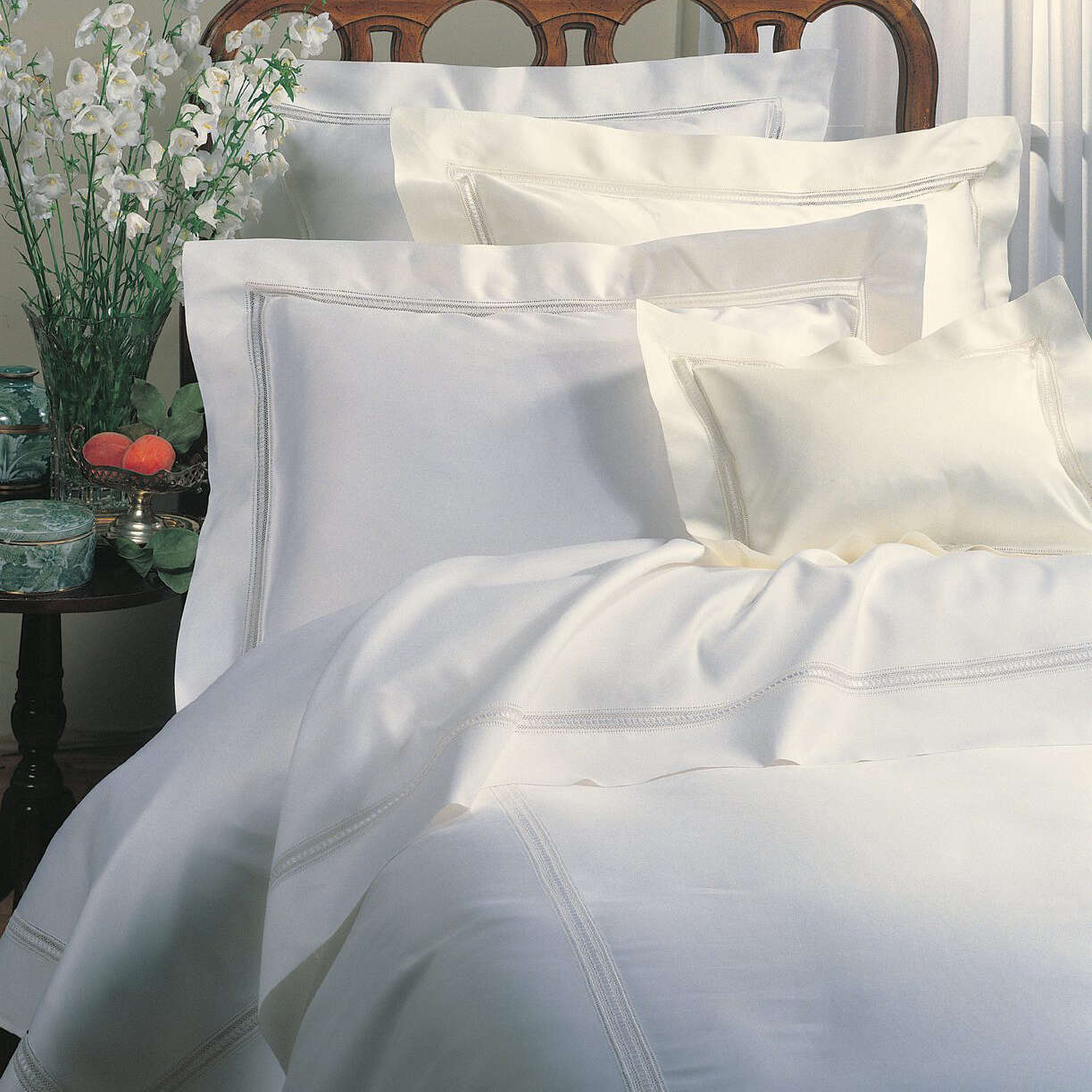 Our luxuriously sleek sateen, Giotto, is the sheeting for our lace-embellished ensemble, Diamante, where a macramé lace inset is threaded through its center with a narrow satin ribbon. To add a final bit of polish and patina, the lace is stitched on either side with delicate hemstitching, making a beautifully refined and elegant bed.