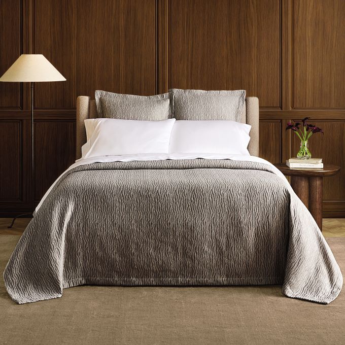 Inspired by landscapes of rolling sand dunes, Ondate is rendered in a two-toned yarn-dye weave that reminisces undulating wavelets. Textural and smooth, the reversible coverlet has a subtle and soft palette in an arresting statement of exquisite artistry.