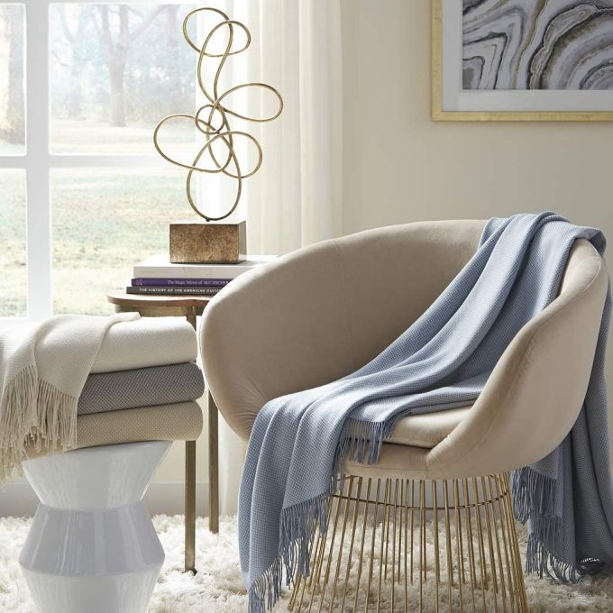 Pima cotton and alpaca fibers are blended to create a lightweight throw with cozy warmth. Two quietly harmonious colors are interwoven in a flat basket weave pattern to create an elegant, tailored throw, finished with twisted fringe.