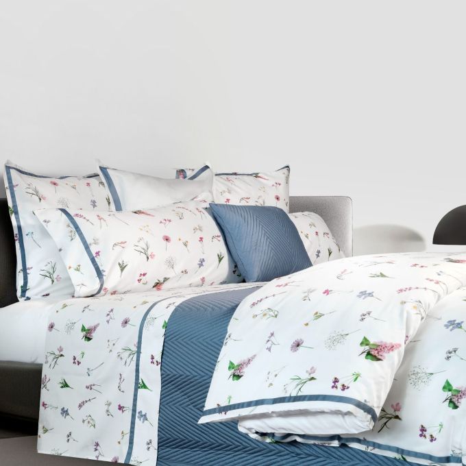 This design evokes the quiet splendor of spring fields in bloom. The floral motif is rendered with meticulous detail on 300-thread-count cotton sateen, delivering a feather-soft hand and a refined, natural luster. A slender border, expertly applied by Signoria Firenze artisans, elevates the piece from simple to sophisticated—an enduring testament to Italian craftsmanship. Made in Italy from long-staple cotton, Brezza invites timeless luxury into daily life.