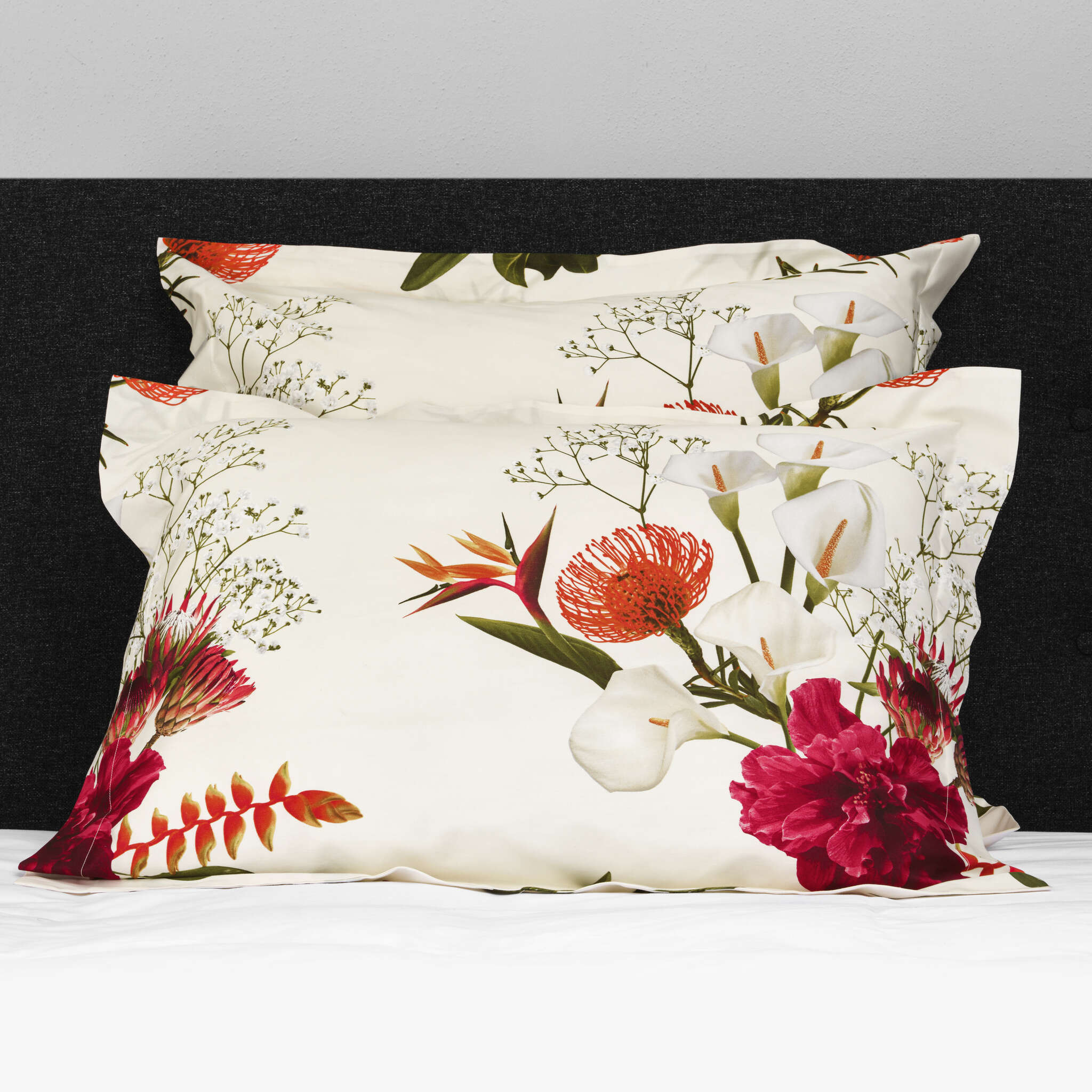 The energy of these flowers in different colors floods your bedroom with strong vitality. The traditional rotary screen print technique enhances the three-dimensionality of the flowers which have been designed to the smallest detail. Available in two color variants: with an Ivory background to furnish the room with more delicacy, and a lead gray background to further enhance the richness of these flowers. Made on a very soft 300 tc extra-long fiber cotton sateen.