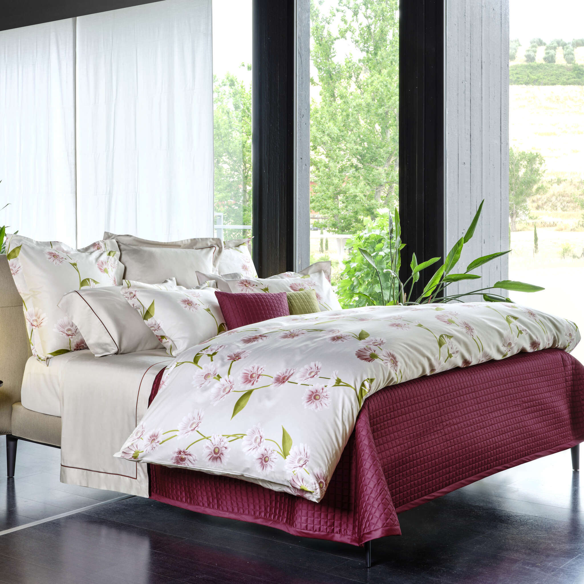 The Gerbera is an immensely popular flower thanks to the bright colors of its petals that convey joy to the surrounding environment. The shape is the delicate one of the daisy but the larger size allows you to greatly appreciate the magnificent shades. Signoria prints on an exceptionally soft long staple cotton sateen, and thanks to the use of traditional rotary screen printing it is possible to capture the amazing three-dimensionality of the flower.