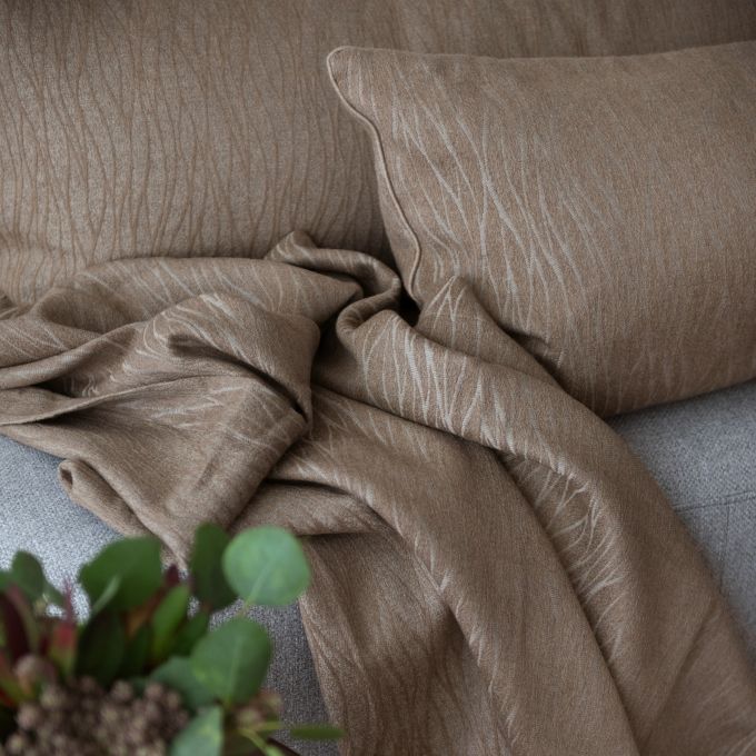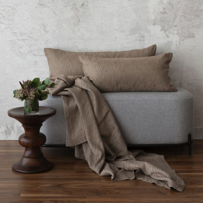 The finest and purest composition of fabrics. Hoxton combines cashmere, silk and cotton, to fashion the most sophisticated textile. Inspired by overlapping waves, Hoxton creates soft geometrics, a wave pattern beautifully finished with a 1.5” mitered hem. This reversible matelassé is designed in brown hues from walnut to oak, while the silk shimmers with glints of lightness.