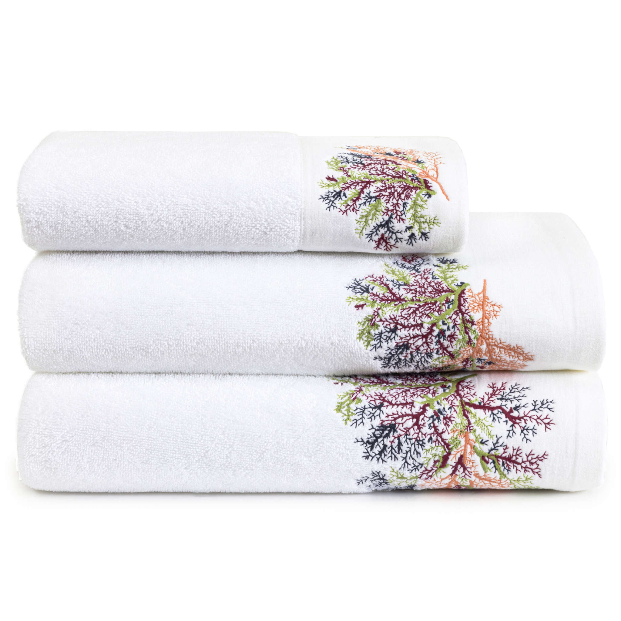 White solid terry towel with linen band finish and placed embroidery.