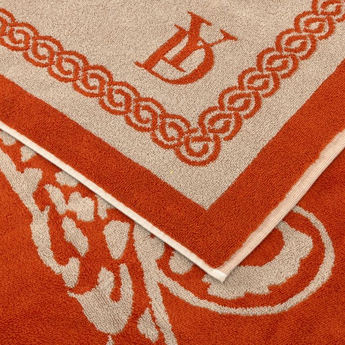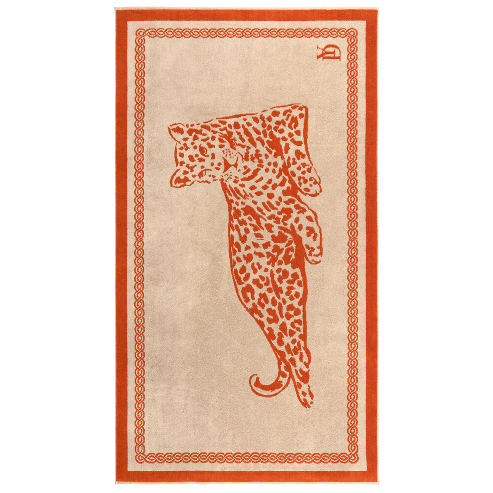 A fun beach towel design by Yves Delorme that is sure to get you noticed. Crafted from pure organic cotton, the jacquard design features a regal-looking image of a leopard set against a beige background. Matching the wild feline's spots, the towel is framed with a contrasting black border and signed off with the brand's logo stamped in the corner.