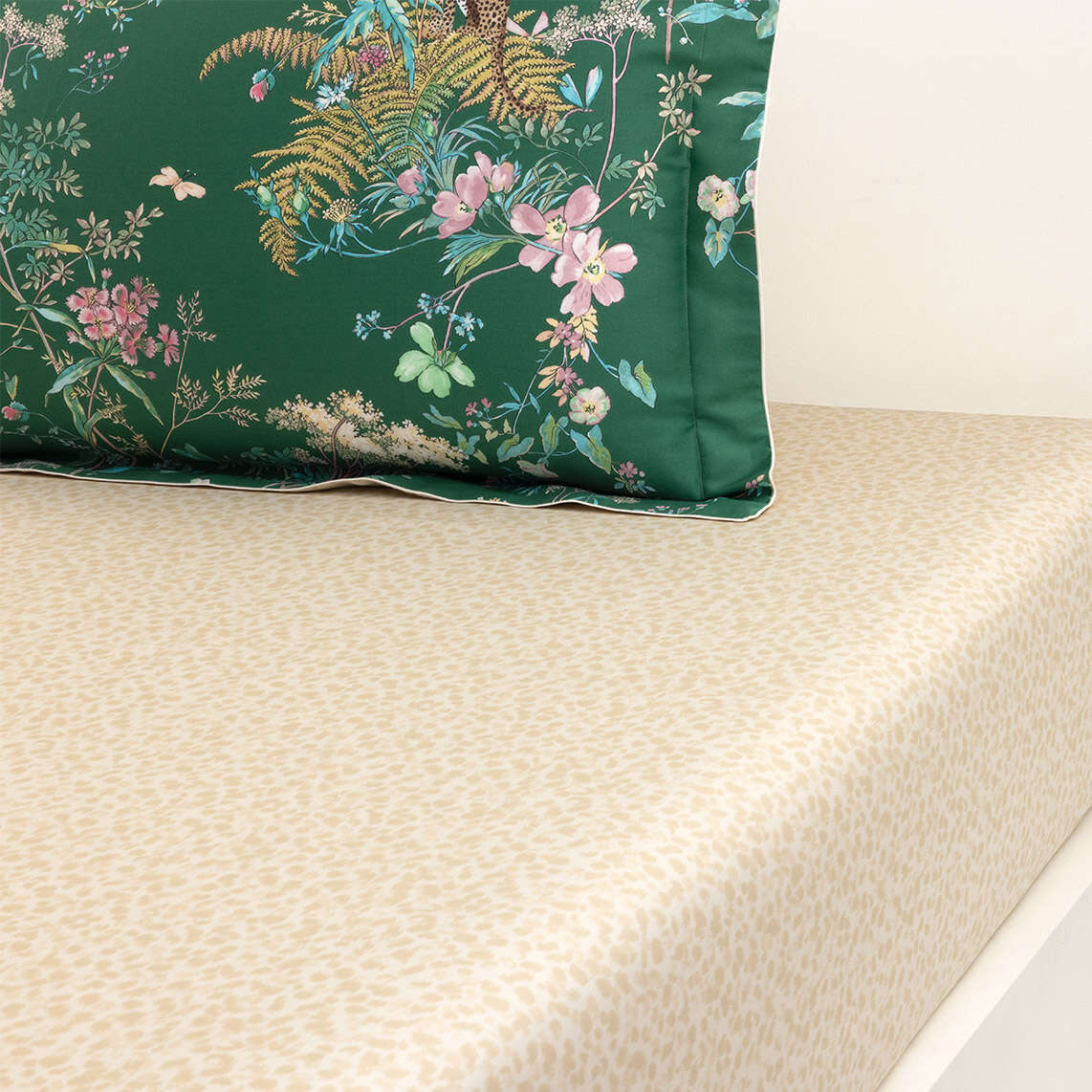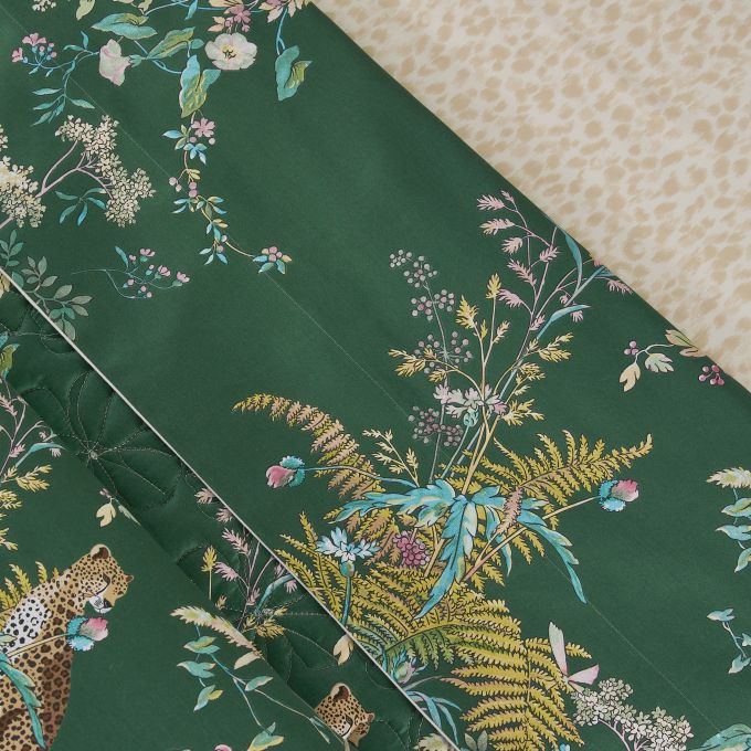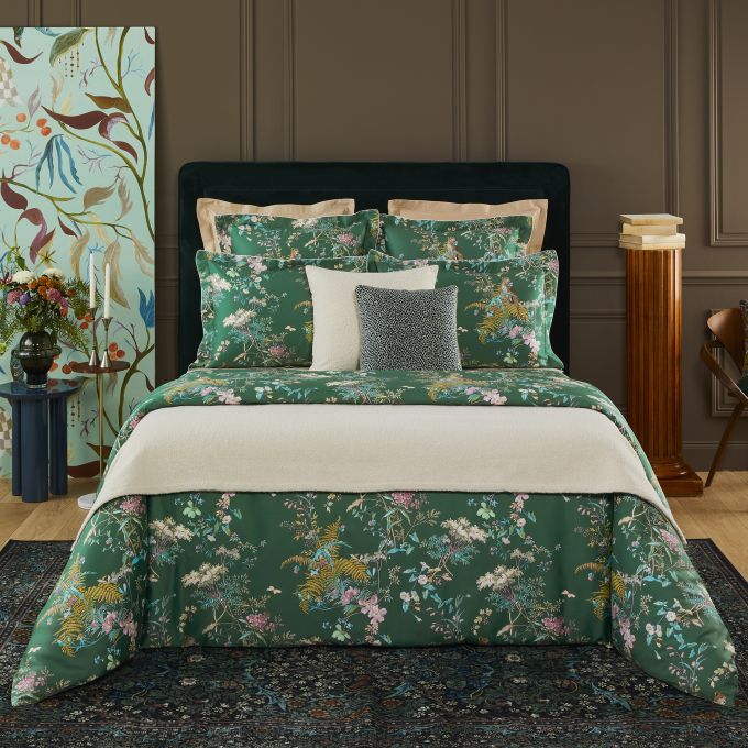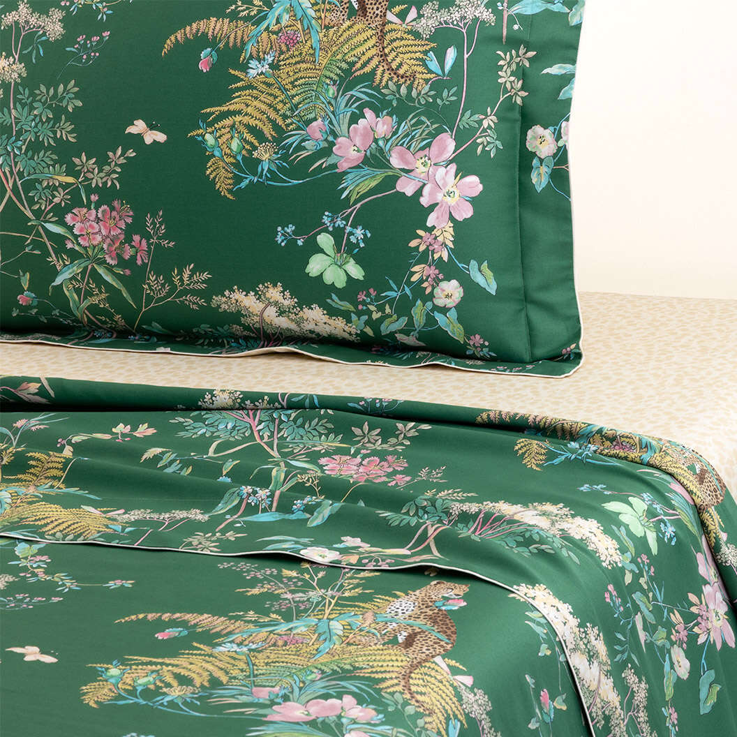 Between ethereal fauna and wild flora, the Contes bed linen set unveils a dreamlike, colorful design printed on luminous sateen, enveloping the bedroom in enchanting charm.