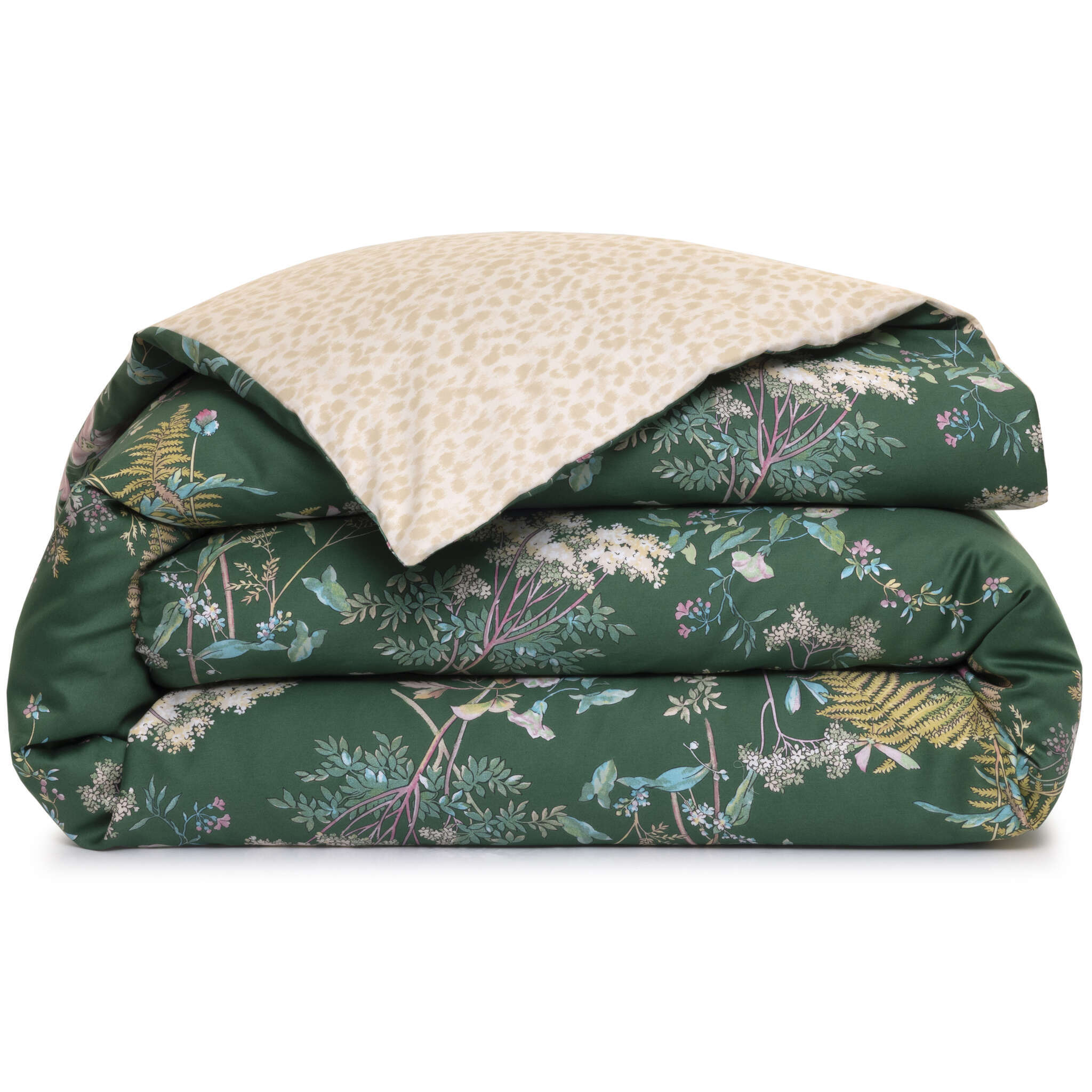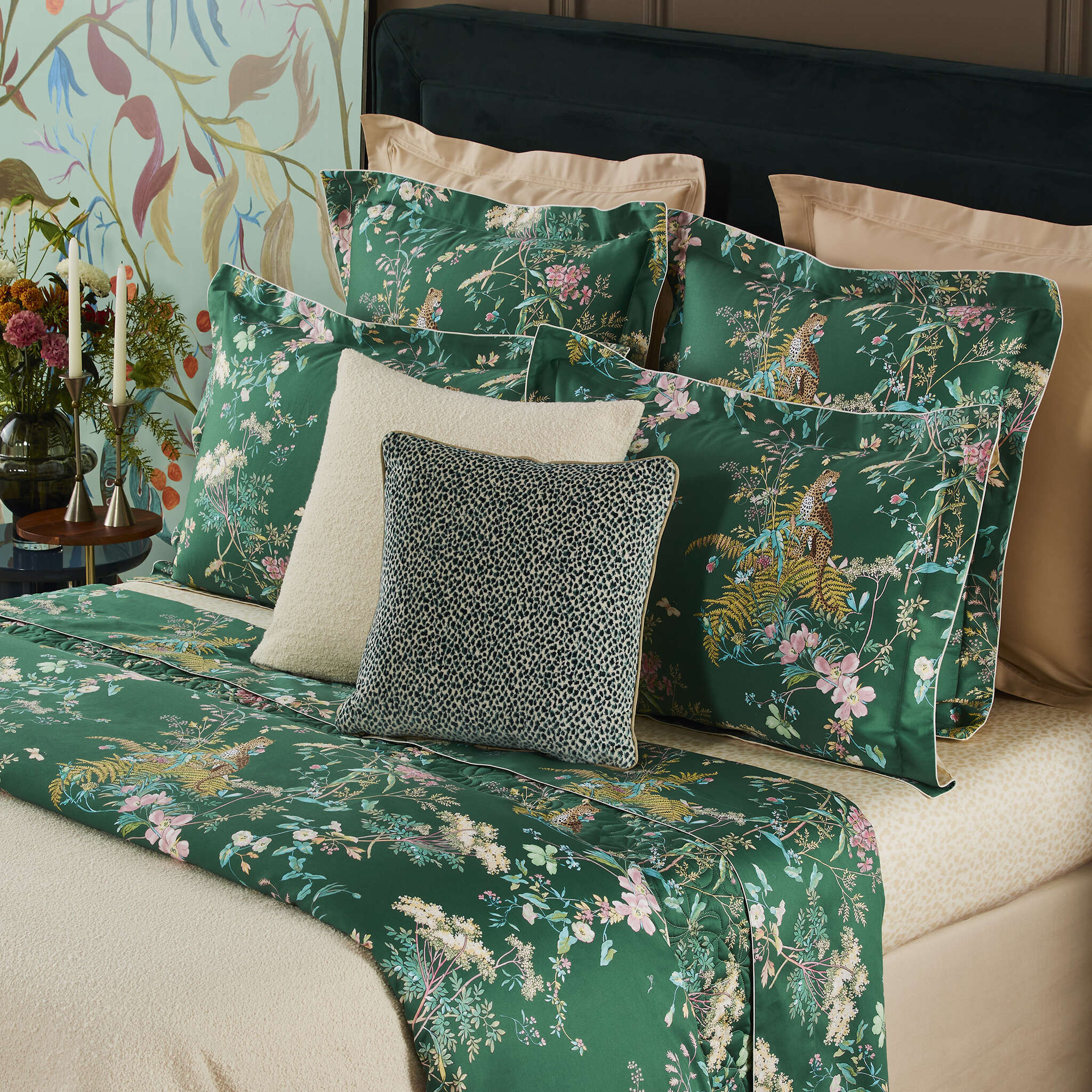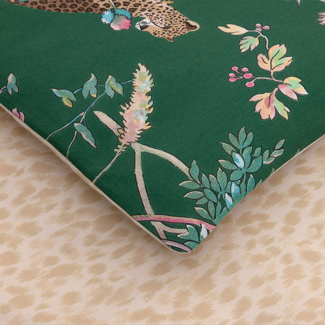 Between ethereal fauna and wild flora, the Contes bed linen set unveils a dreamlike, colorful design printed on luminous sateen, enveloping the bedroom in enchanting charm.