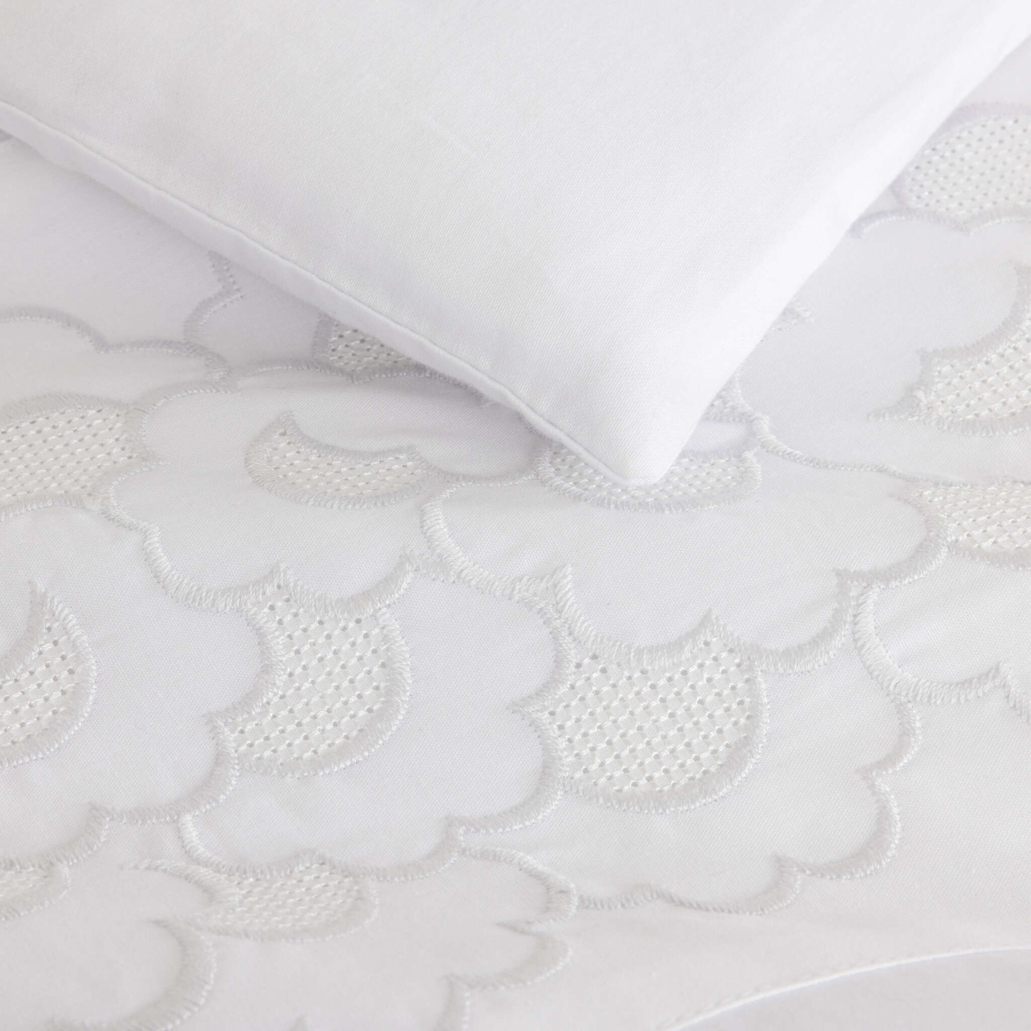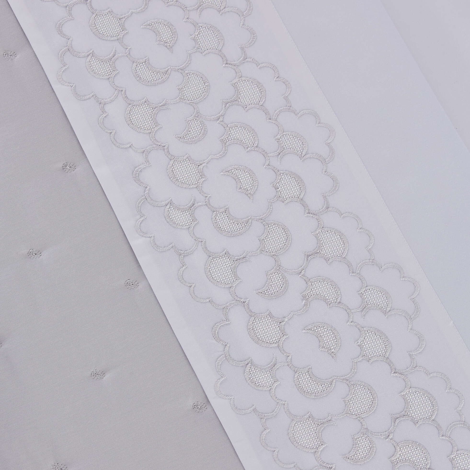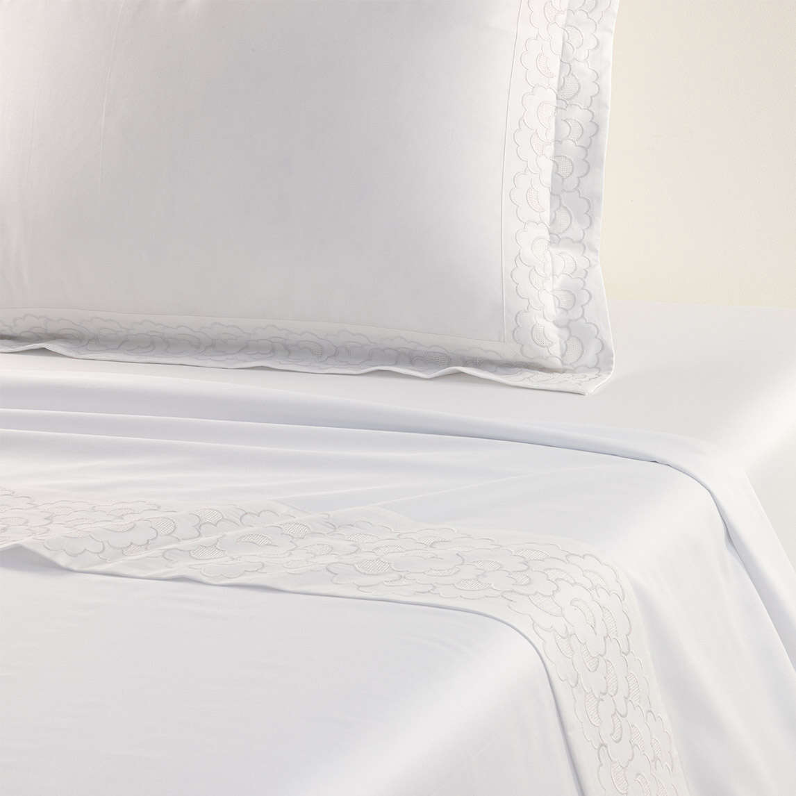 Inspired by the glamour of the Roaring Twenties, the Festons bed linen collection by Yves Delorme brings a refined elegance to the modern bedroom. Delicate floral bourdon and gauze embroidery are revealed on crisp white 100% organic cotton sateen, with a silver palette and scalloped design that evokes the bold symmetry and luxury of Art Deco design. The collection captures the spirit of an era where sophistication met simplicity.
