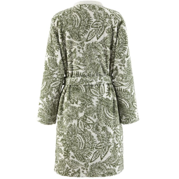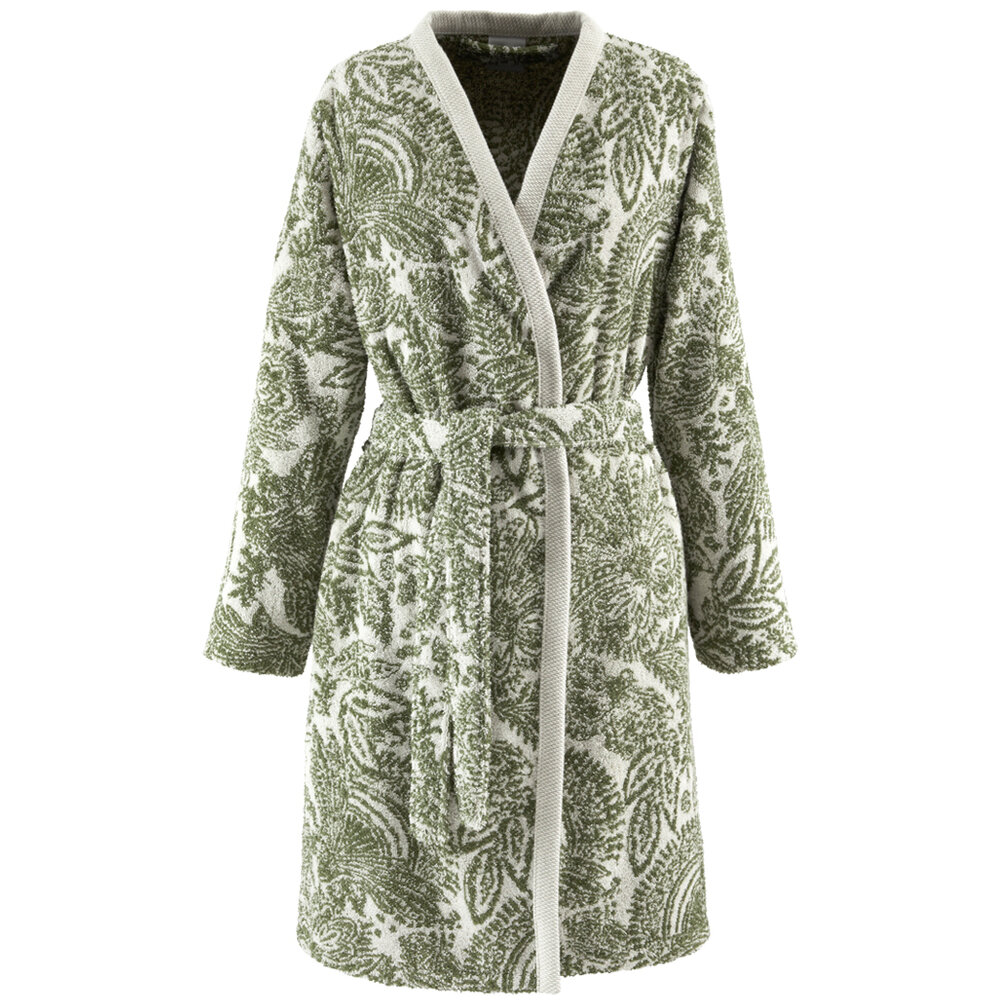 Jacquard with border trim, kimono, pockets and belt.