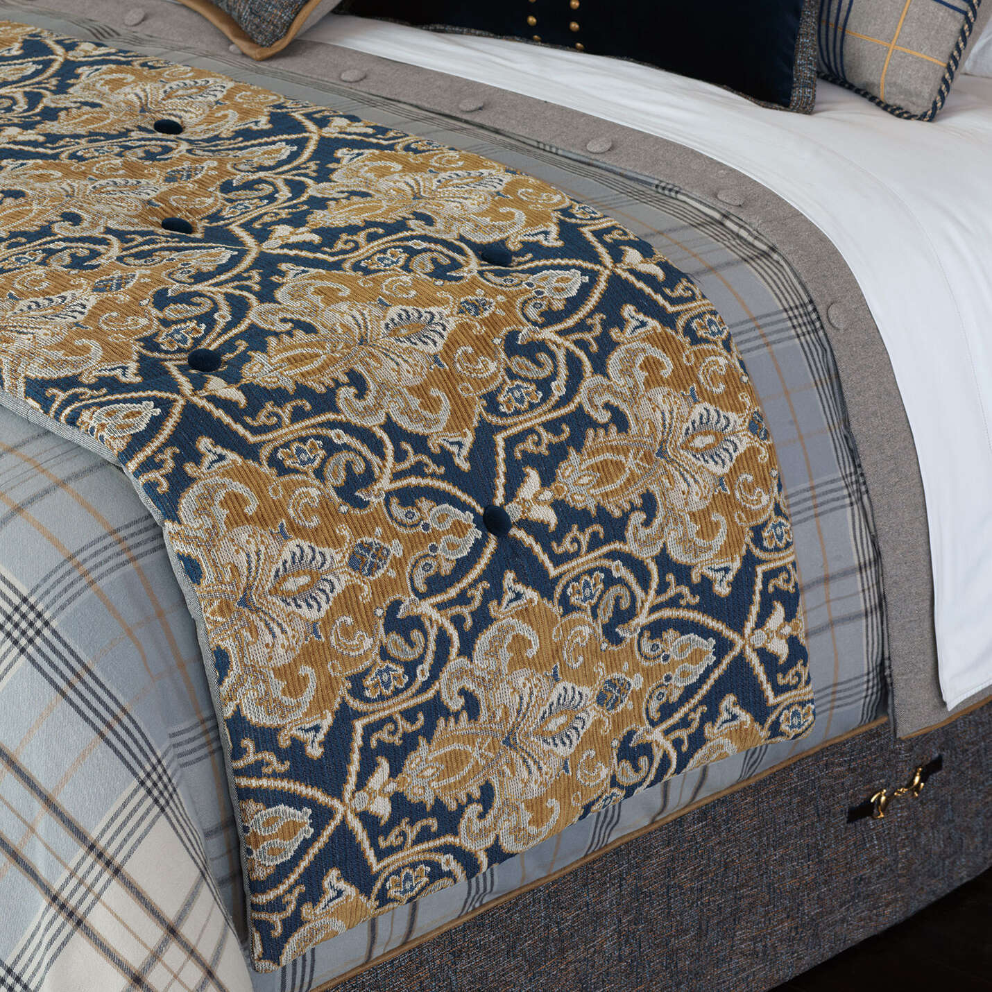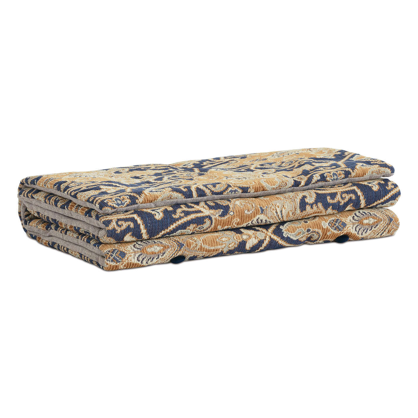 Damask fabric face in blue and gold.