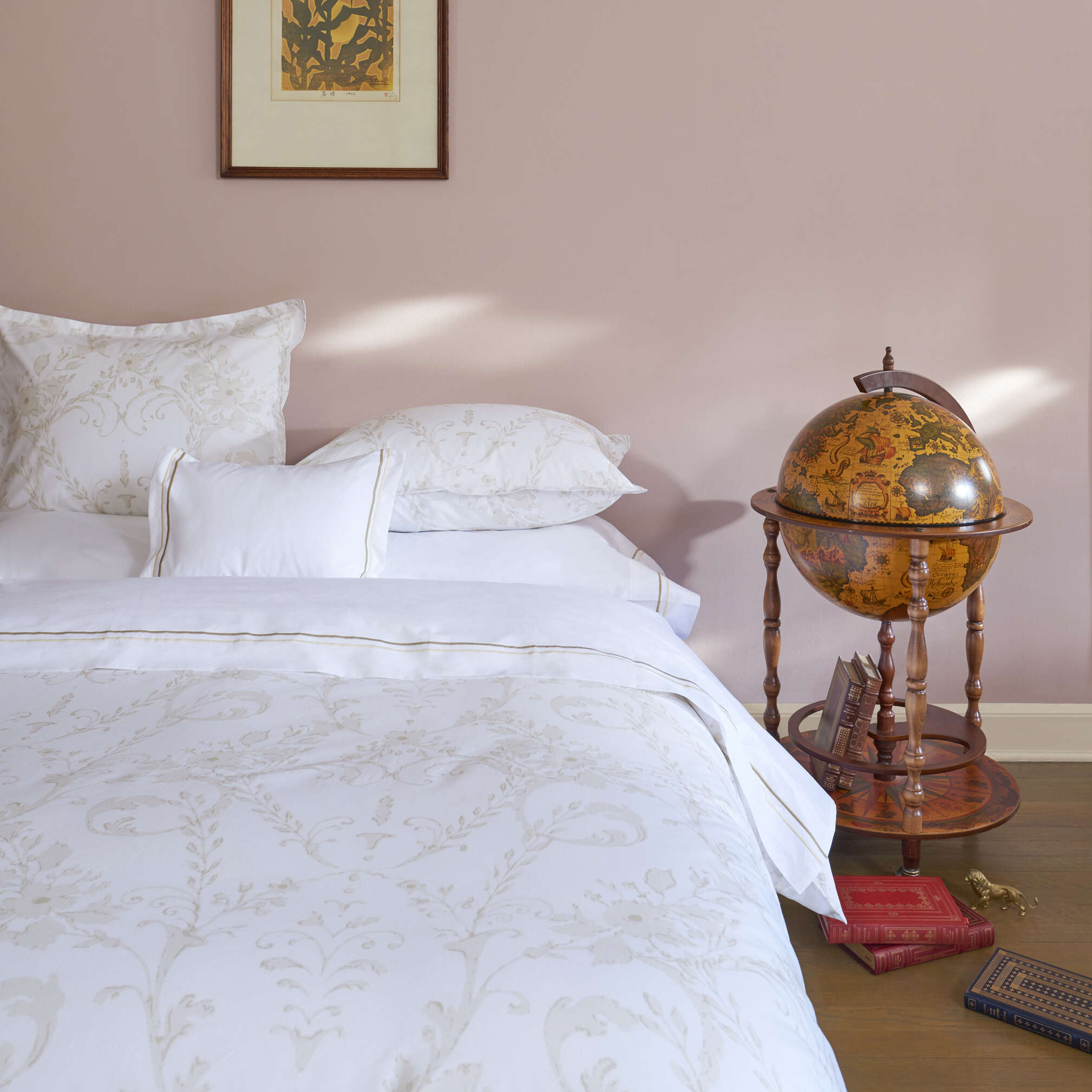 Bedding with a large scale floral pattern in soft and soothing colors, Aurora by Stamattina fine linens, is a stunning focal point on any bed.