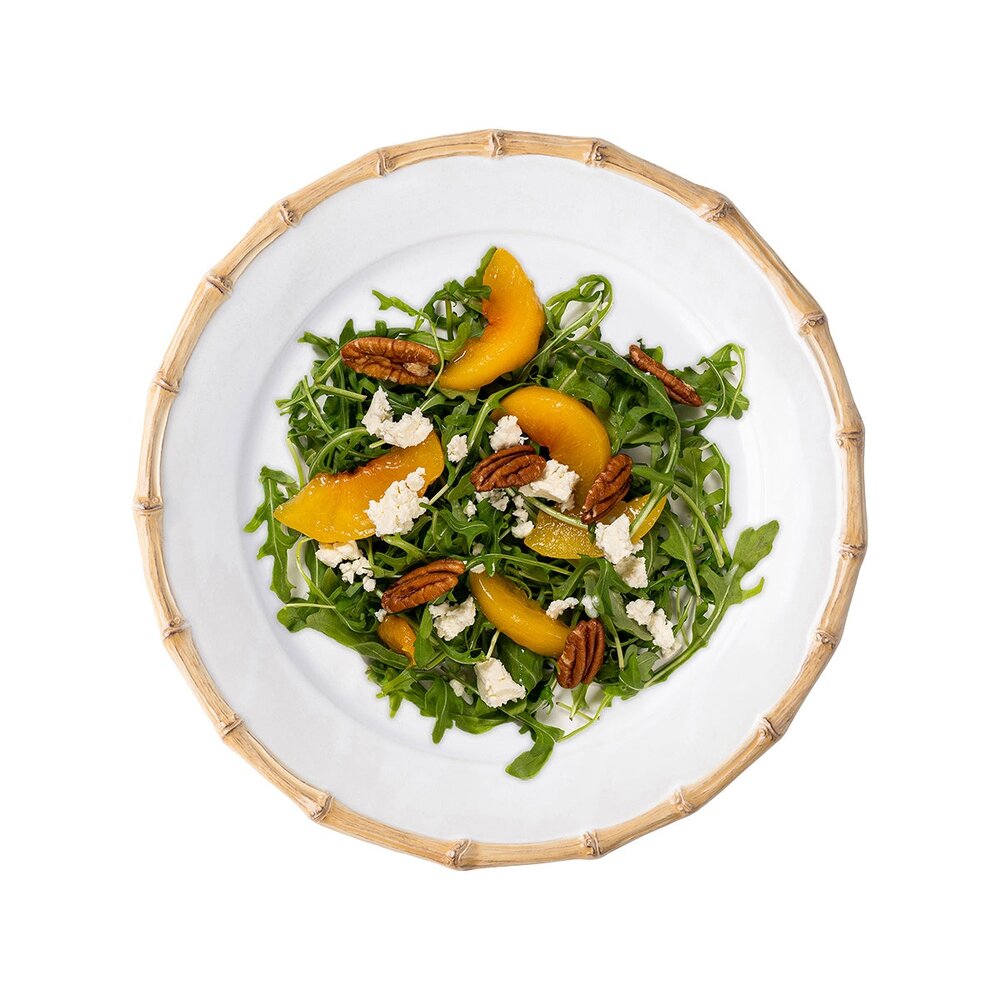 From our Bamboo Collection- A clean modern shape is encircled with the timeless aesthetic of bamboo for a look that translates across continents. Use this chic plate as a serving platter for appetizers or as a cake plate.