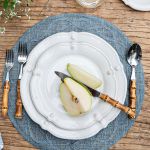Dishwasher (avoid high heat), freezer, microwave and oven safe (up to 500 degrees). We recommend hand washing pieces that contain a non-ceramic component, such as metal, gold or platinum; please note these items are not microwave safe. Avoid cleaners that may contain citrus. While not common, over time, metal trail markings may occur on the stoneware surface dependent on your flatware. These marks are not scratches, and not due to a manufacturing defect in our ceramics, but steel residue on top of the glaze left by stainless steel flatware. Using a combination of citrus cleansers and high heat in your dishwasher can lead to more prominent metal markings.