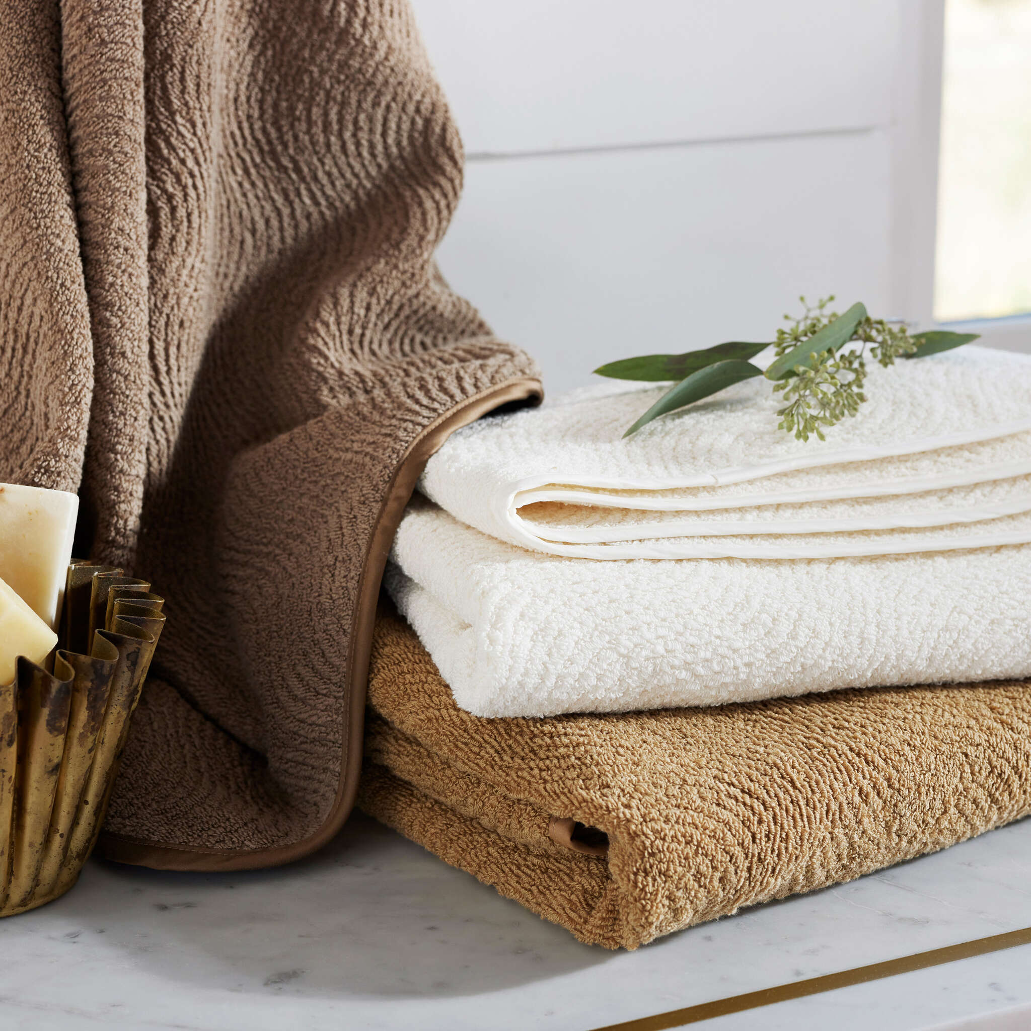 Our prewashed bath towels and robes combine the luxurious feel of cotton with the added strength of linen. Wrap yourself in casual elegance. With its large bold wavy pattern, this striking style is reminiscent of the beautiful California Coast.