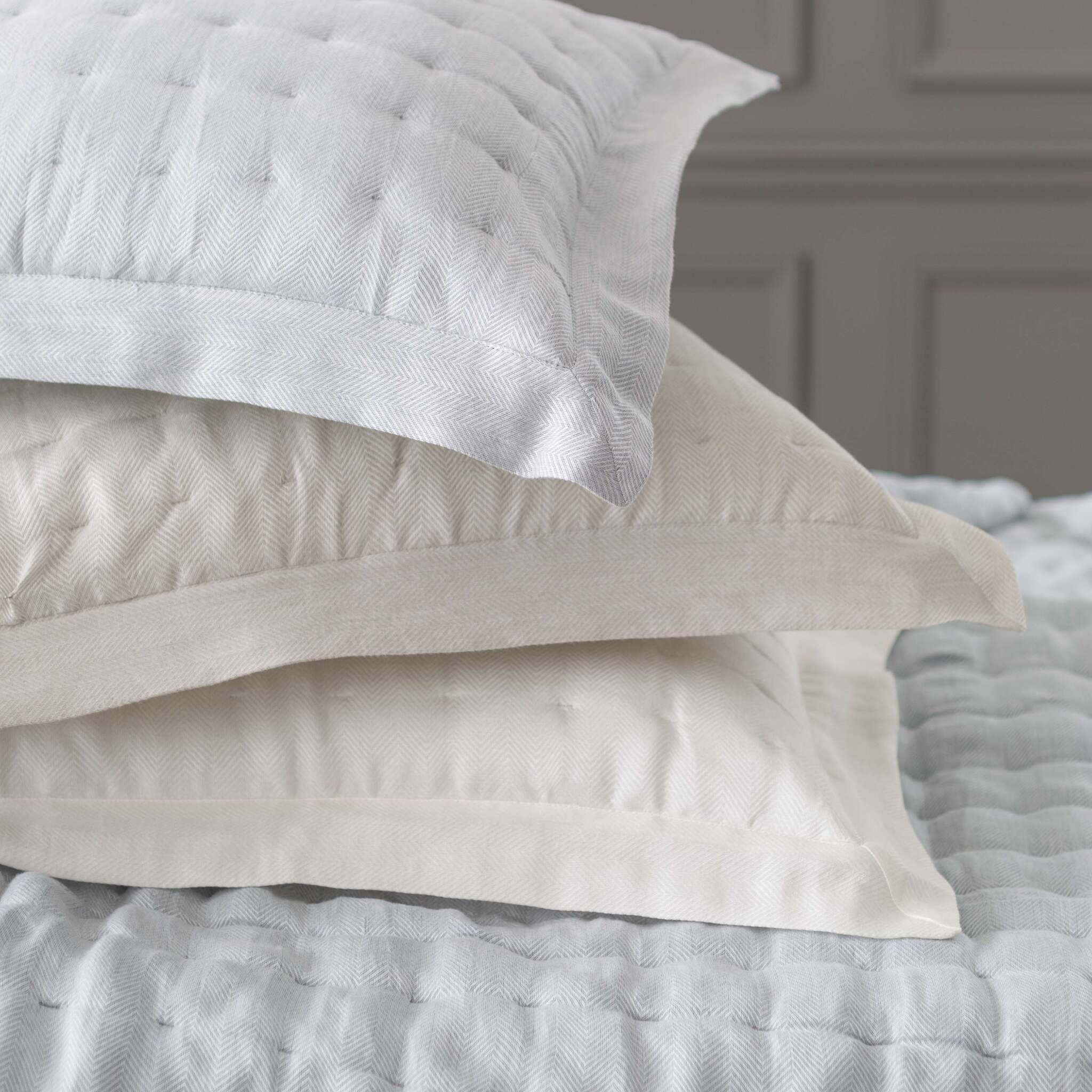 Silky smooth fabric, lofty filling, and hand-tied details make a quilt of delicious warmth without the weight. The gorgeous two-tone linen/viscose weave in a classic herringbone pattern is finished with a substantial flanged and mitered edging.