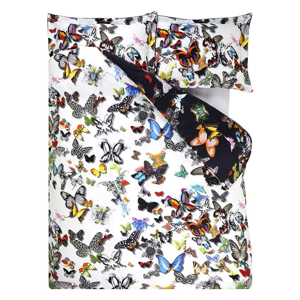 This iconic butterfly print by Christian Lacroix is now stunningly created for bedding. An expressive parade of colorful butterflies from the stylised to graphic are enhanced by the subtle shadows. Fully reversible style with black and white grounds, this luxurious designer bedding is digitally printed onto cotton sateen. Completed with statement pillowcases and packaged in eco reusable fabric pouches with button closure.