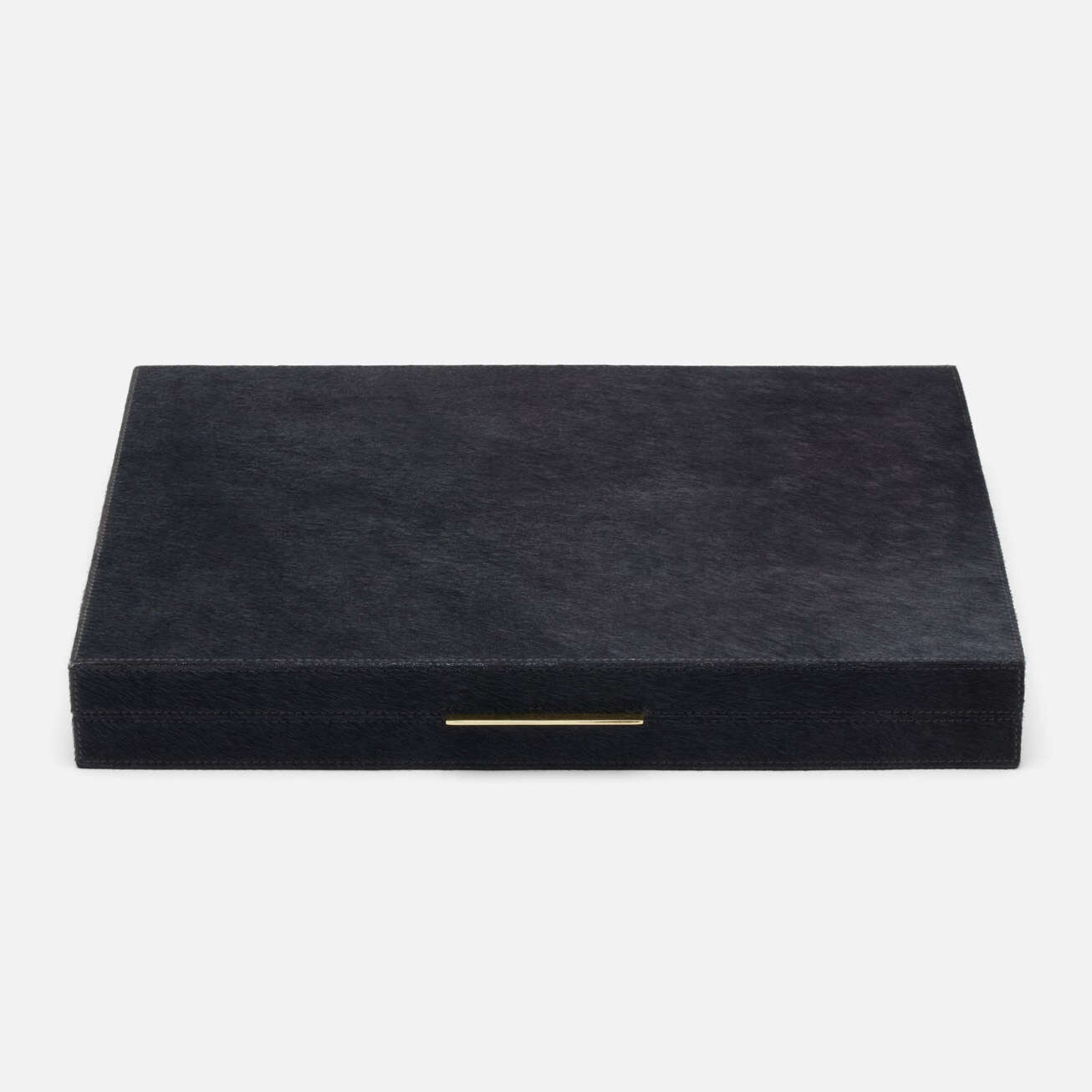 A hair-on-hide backgammon set worth displaying. The board game interior beautifully features alternating gray full-grain leather and striped hair-on-hide details, along with natural bone nand dark horn playing pieces.