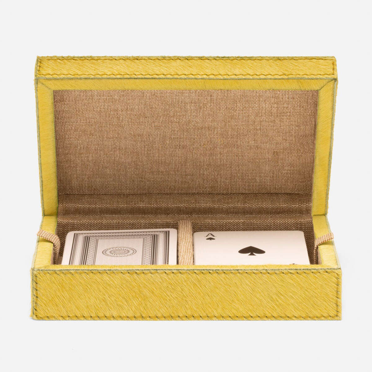 Alluring solid hair-on-hide boxes house two decks of cards for a fun night in. Interior lined with natural chambray.