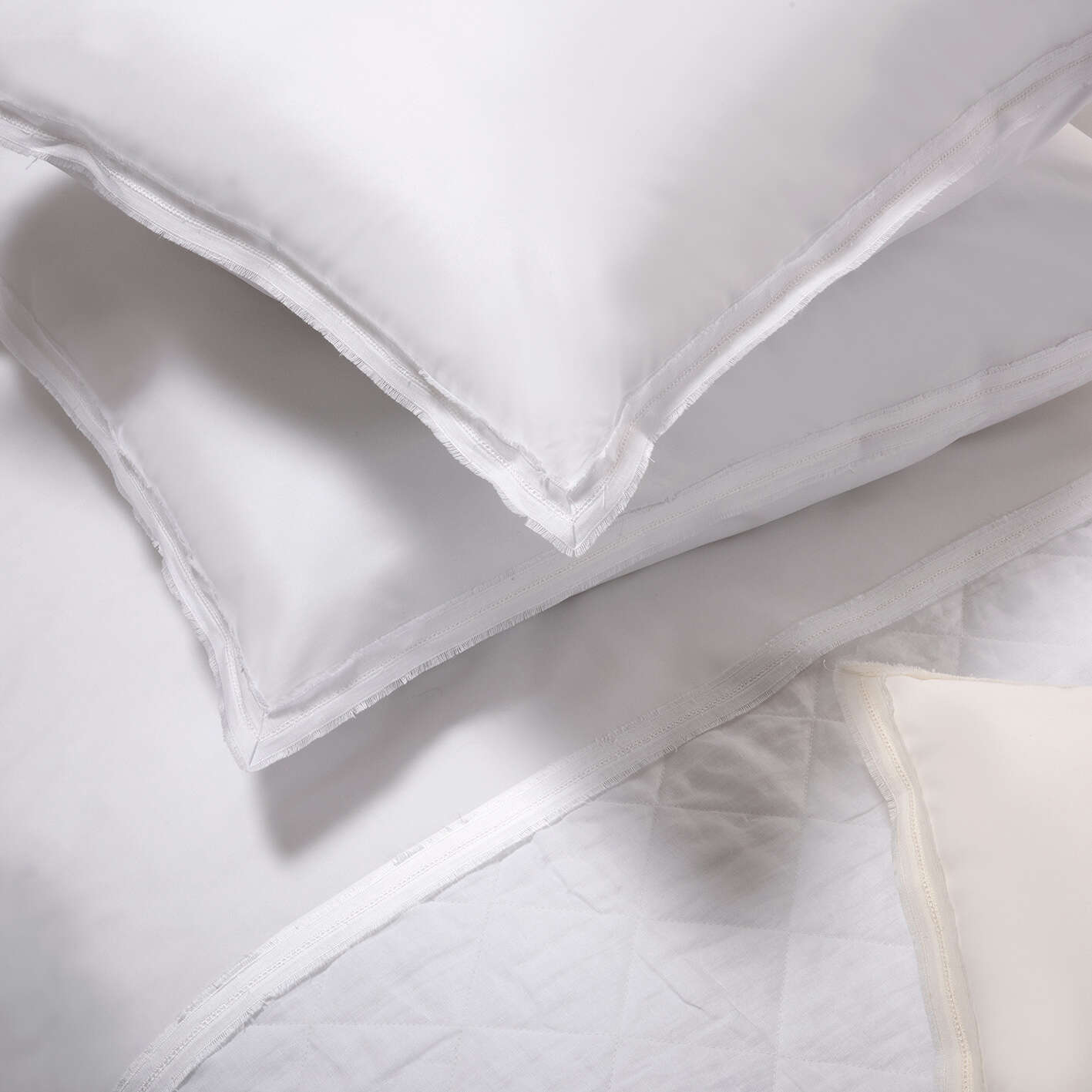 Fabric worked with a simple weft, i.e., the warp and weft threads are worked perpendicular to each other. Fabric-onfabric appliques generate color contrasts or particular visual and tactile effects by combining different textured fabrics. This effect is achieved in the Clara Collection with an elegant prewashed linen applique that gives a modern fringed effect to the edges. Elegant open-work adorns this applique, recalling our tradition of fine craftsmanship.