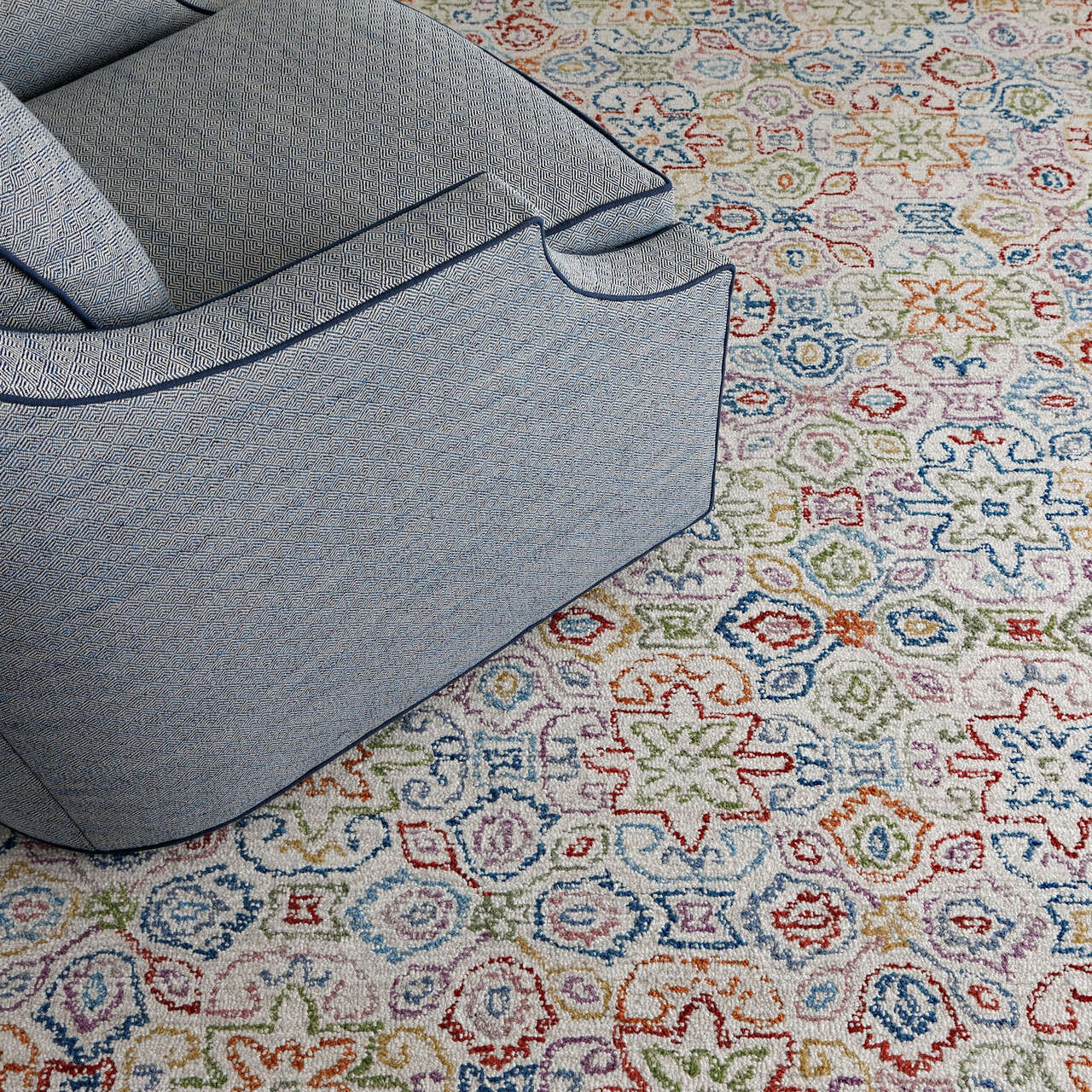 Inspired by cross stitch designs traditional to many cultures around the world, our multicolor rug on a natural ground is a perfect complement to many room styles. The pure wool loop pile is a wonderfully soft foundation.