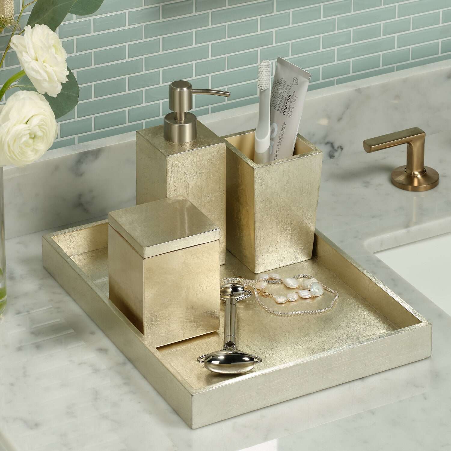 Crafted from silver leaf with a champagne gold finish, our Davos collection adds a distinguished touch to the bath. Each item instills a bit of a regal touch, instantly elevating any bath.