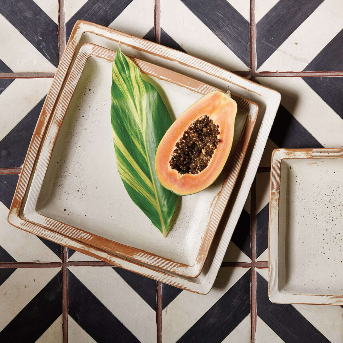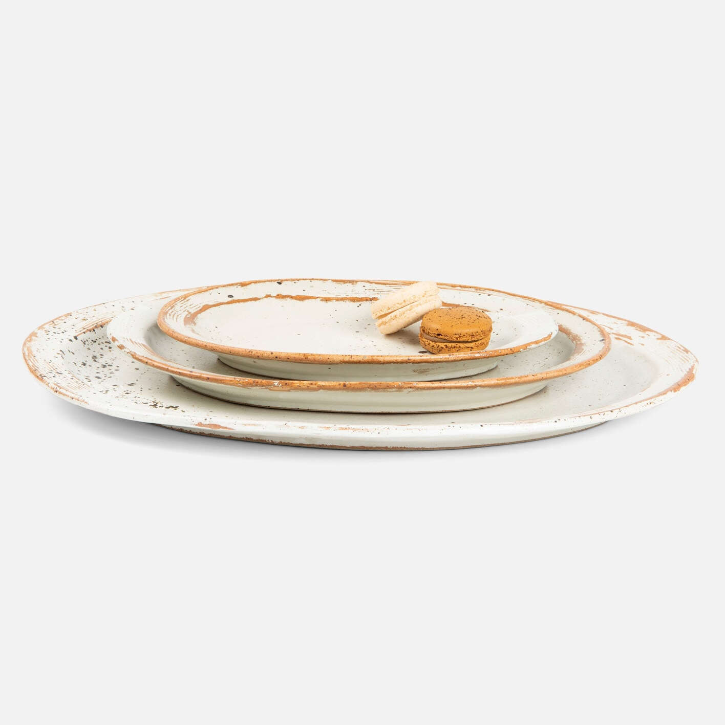 The Rustic White finish over the stoneware's original hue gives Dawson's serving trays and bowls a nostalgic feel.