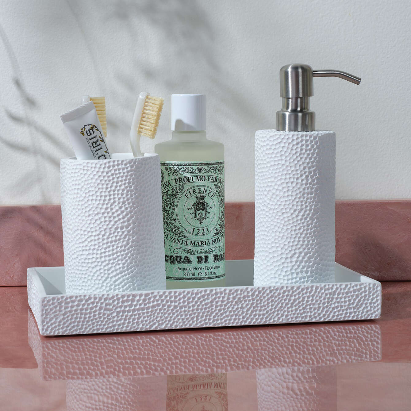 Crafted from engraved resin with a delicate dimpled texture the Dover collection adds a simple yet elegant touch to any bathroom.