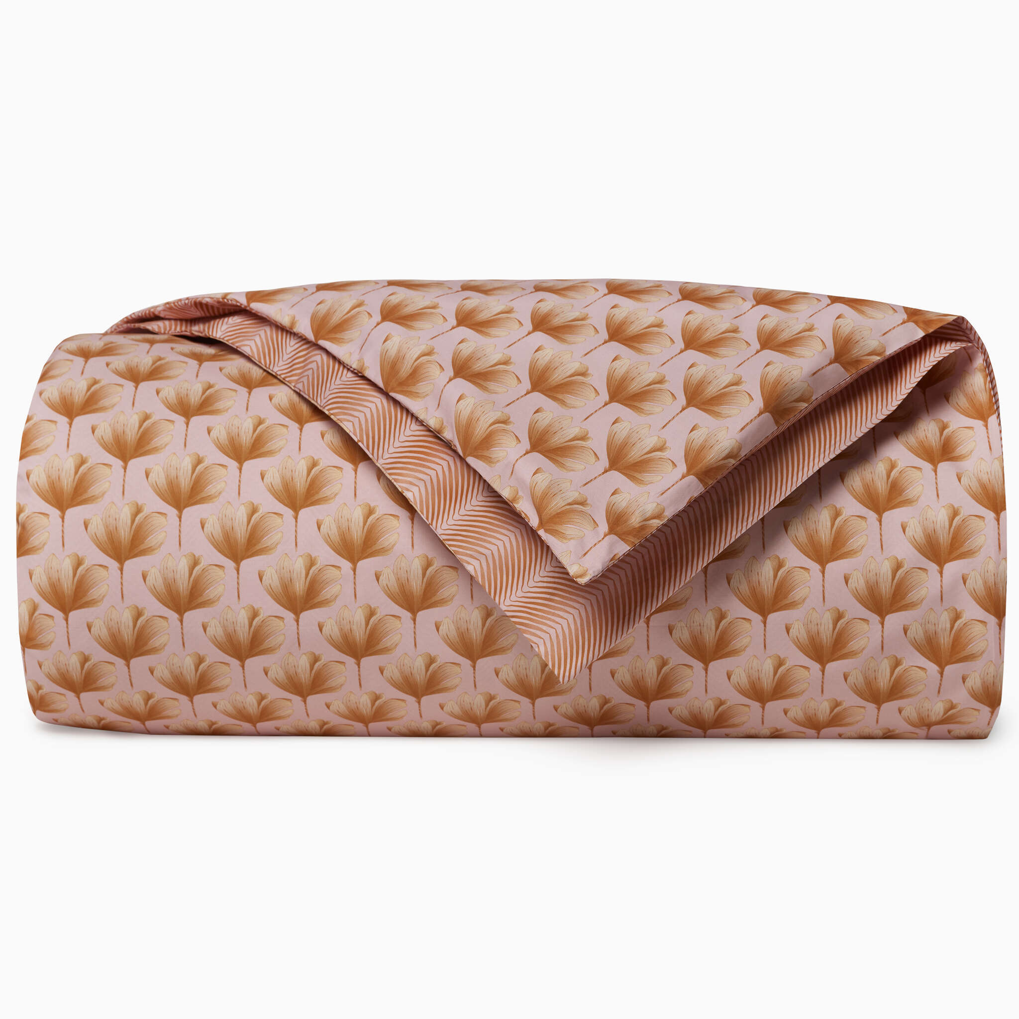 Printed on Italian-woven long-staple cotton, in two striking colorways, Edna is an ode to vivid extravagance. The reversible design offers two distinct expressions of artistry. On one side, a repeat Ginkgo leaf pattern, symbolizing beauty and enduring quality with its graceful form. On the other, a minimalist art deco texture unfolds, kaleidoscopic in its mesmerizing symmetry.
