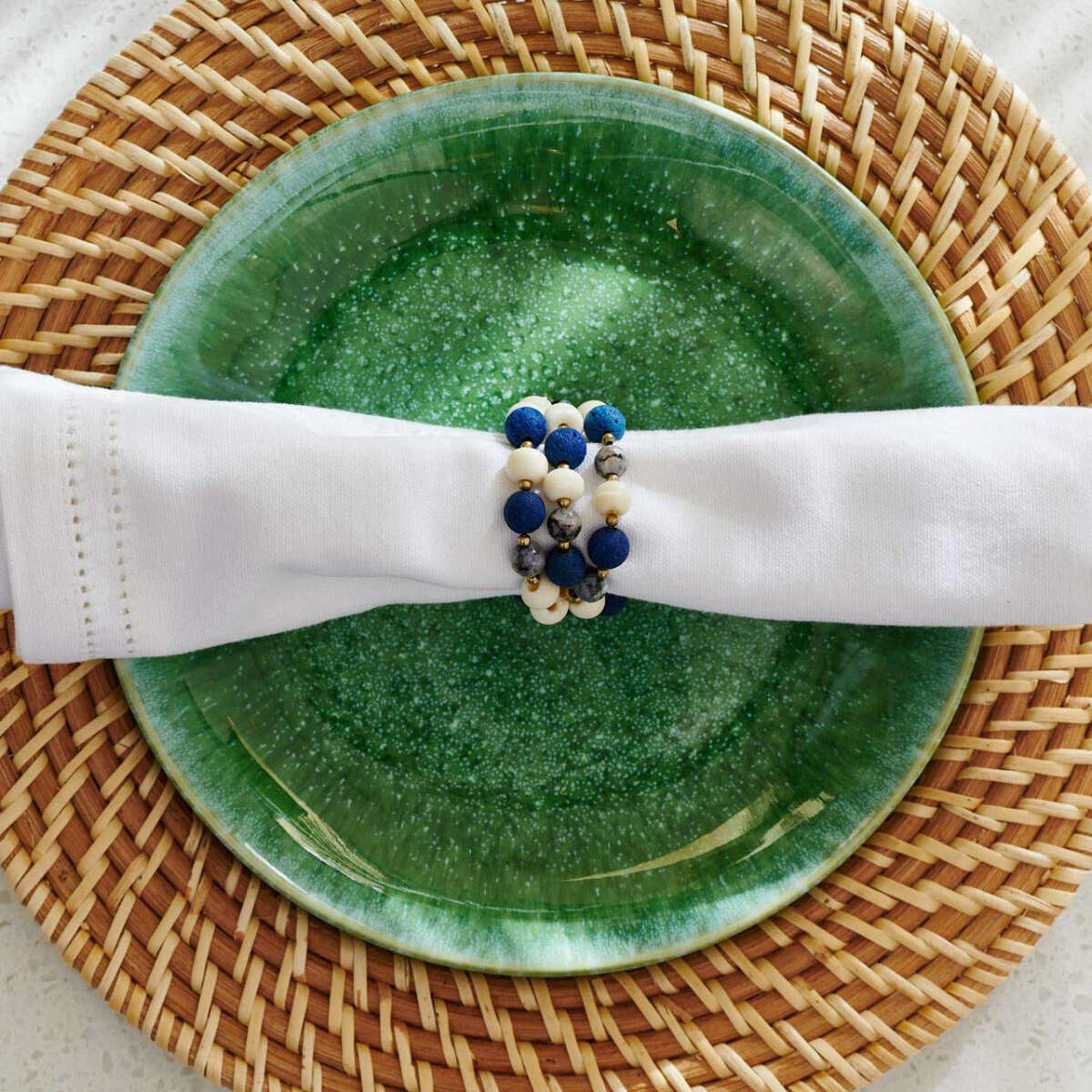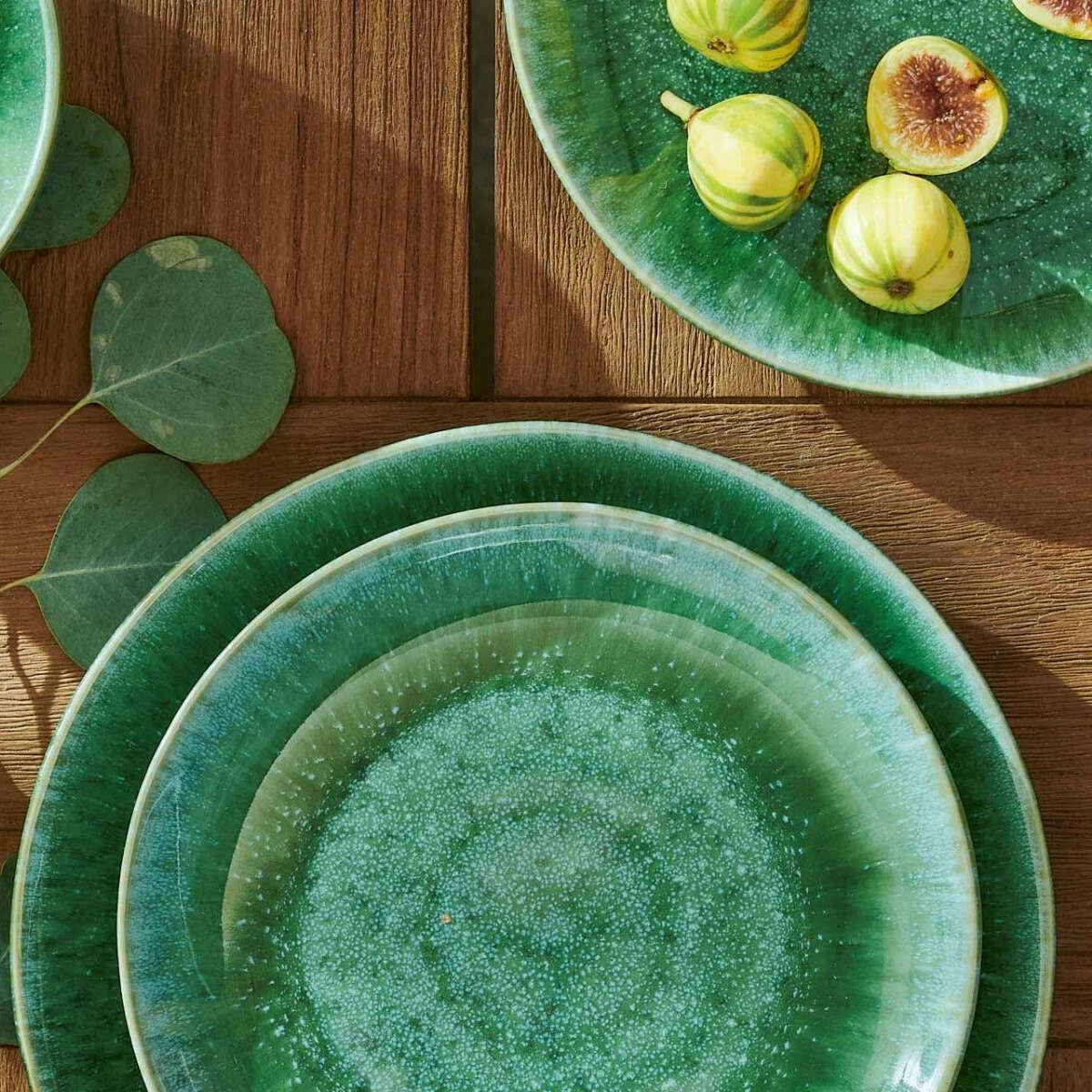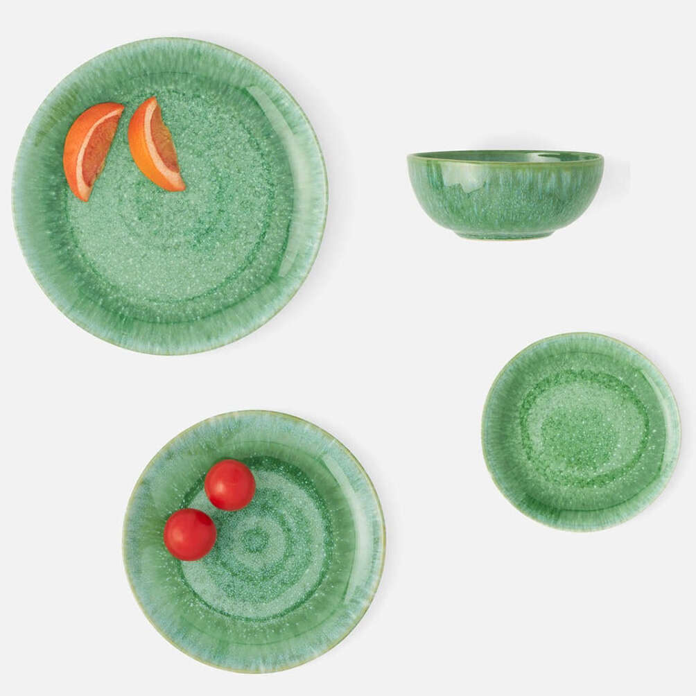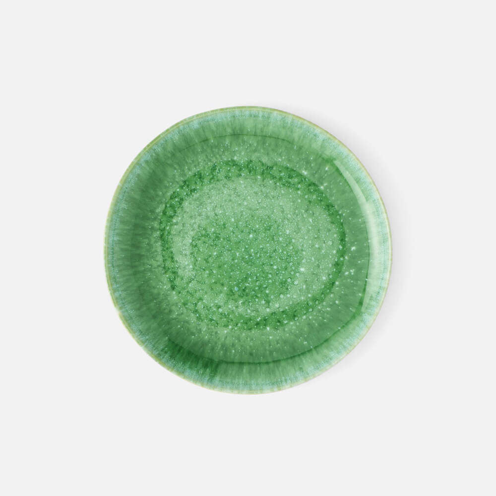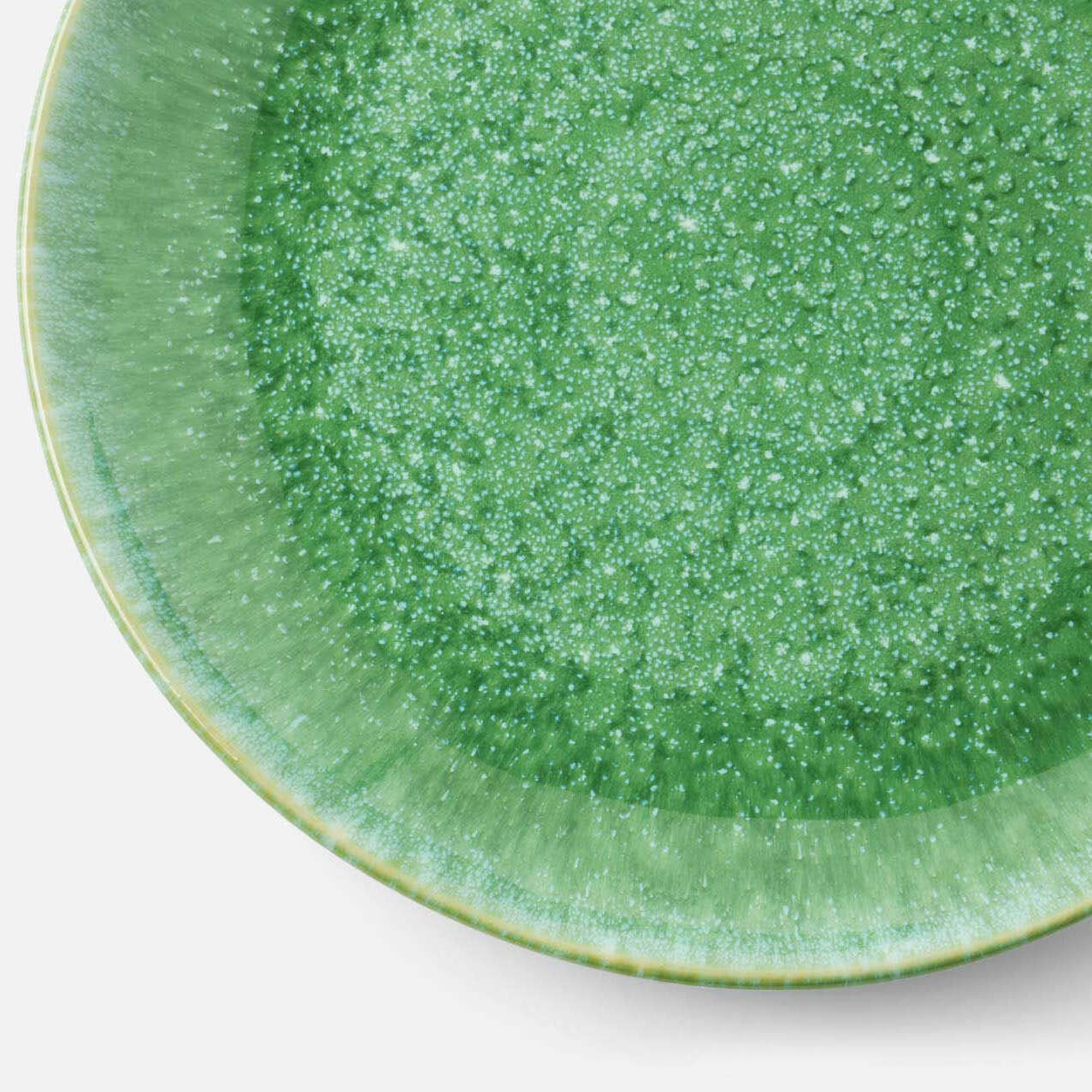 Reactive emerald glaze, speckled in white, gives our Eloise galactic depth. This handmade stoneware collection fills the table with free-spirited elegance.