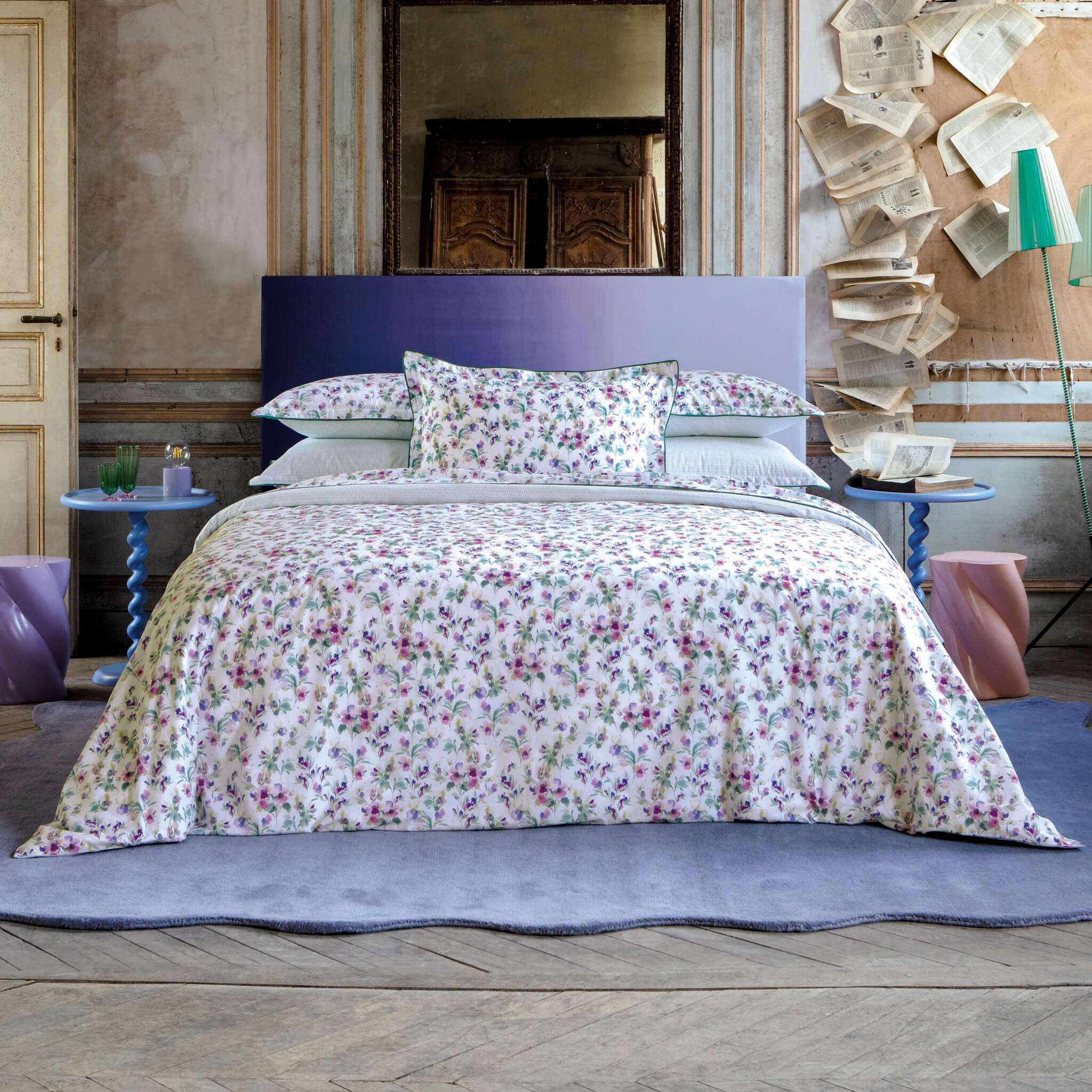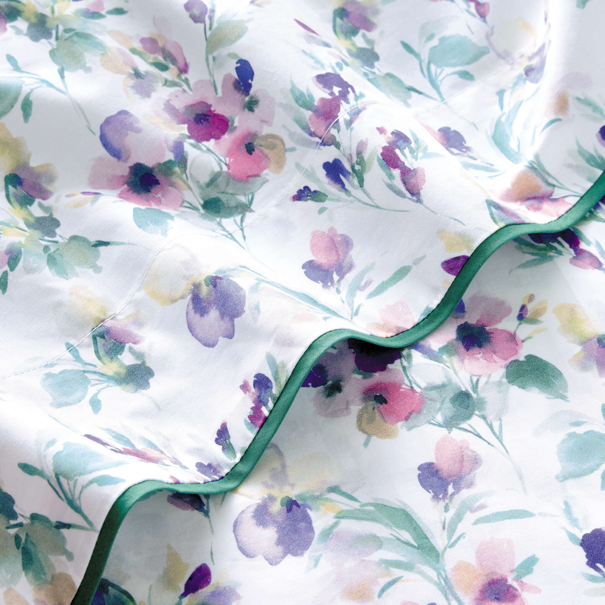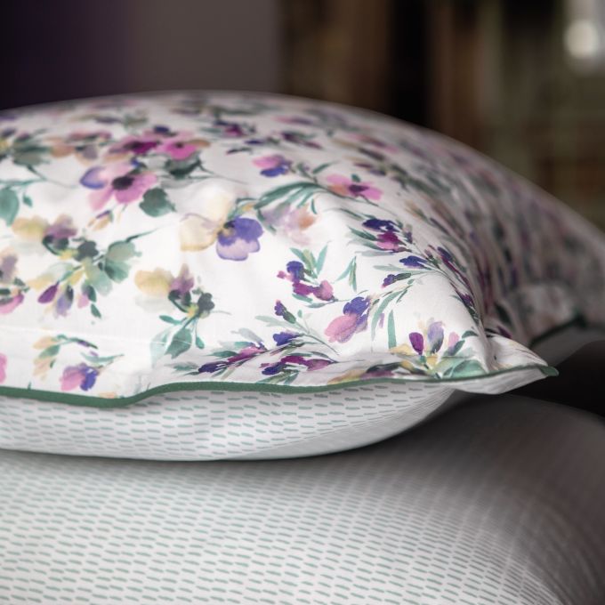 A soft watercolor floral motif in evanescent hues transports us to a world between dream and reality.