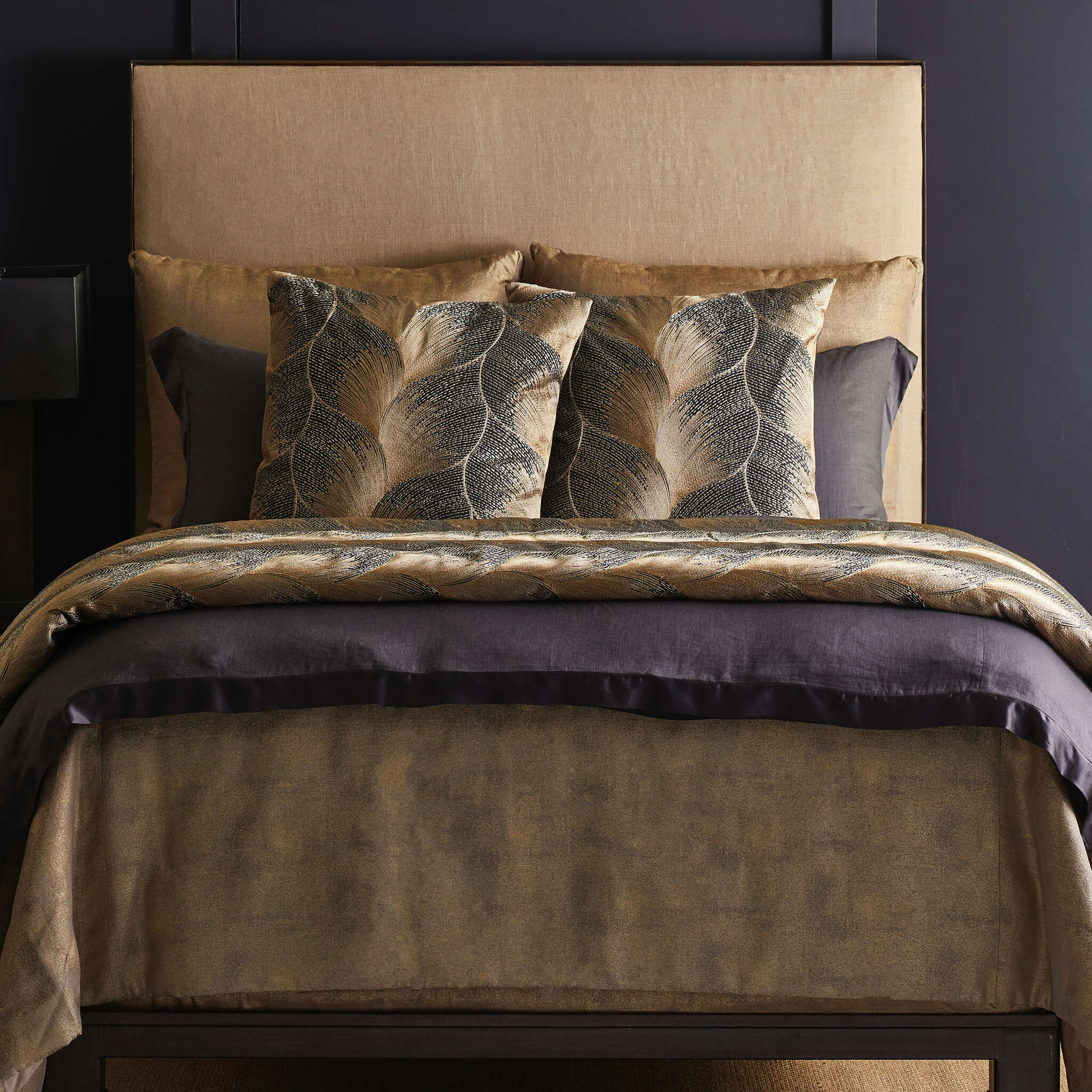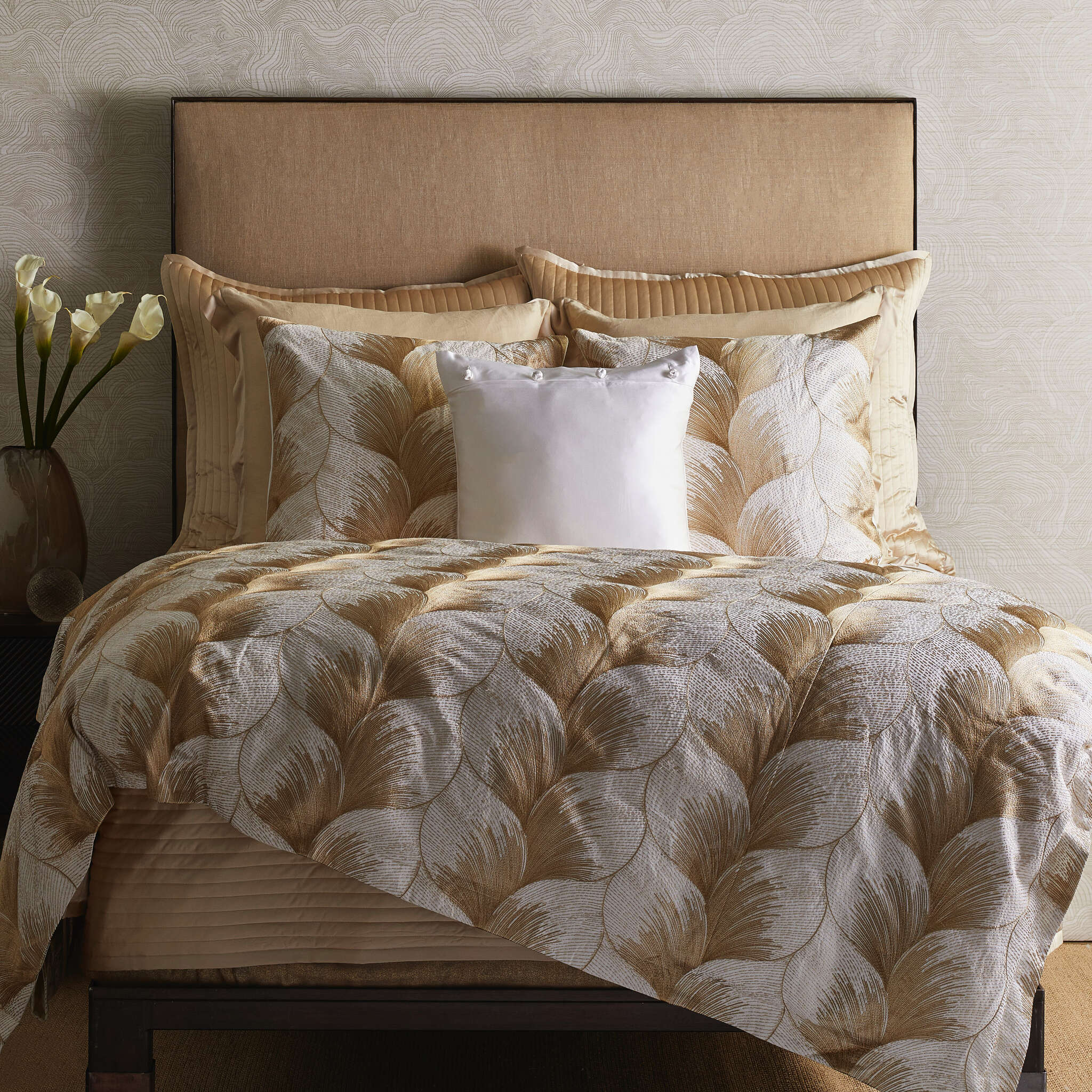 Embroidery undulates on a linen ground in gold on umber, and gold on white. Based on a gilded fan from The Met’s Costume Institute.