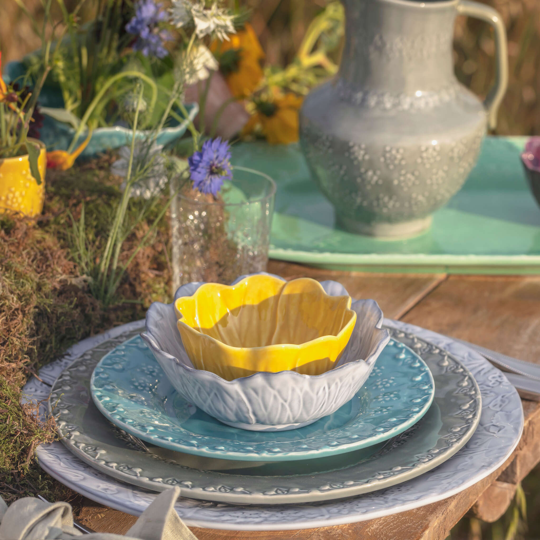 Relaxed and trendy, the new Flora collection by Bordallo evokes a relaxing stroll in the countryside, in that chosen refuge where we seek the serenity and inspiration that only nature in its purest state can give us. Flora brings together a herbarium of plants and flowers, which small and graceful insects are busy around, paying tribute to the beautiful and delicate balance of ecosystems. Plant diversity, which includes poppies, marigolds, dandelions, wild roses, mallows and hawthorn berries, populates the surface of the pieces in high and low reliefs full of detail, with soft country colors accentuated by the unique transparency of the brand's glazes. A versatile line, Flora allows for countless combinations, giving any table the Bordallian DNA: nature, vivacity, imagination and joy.