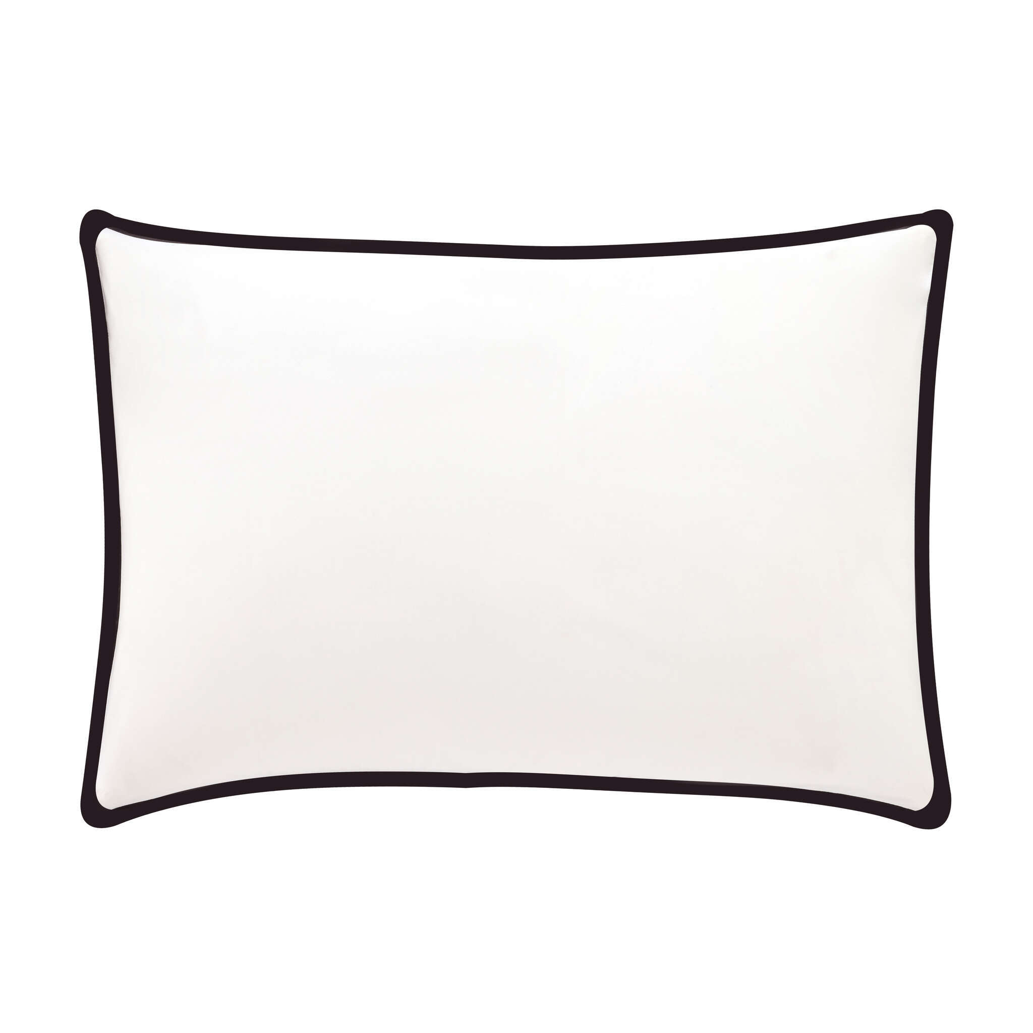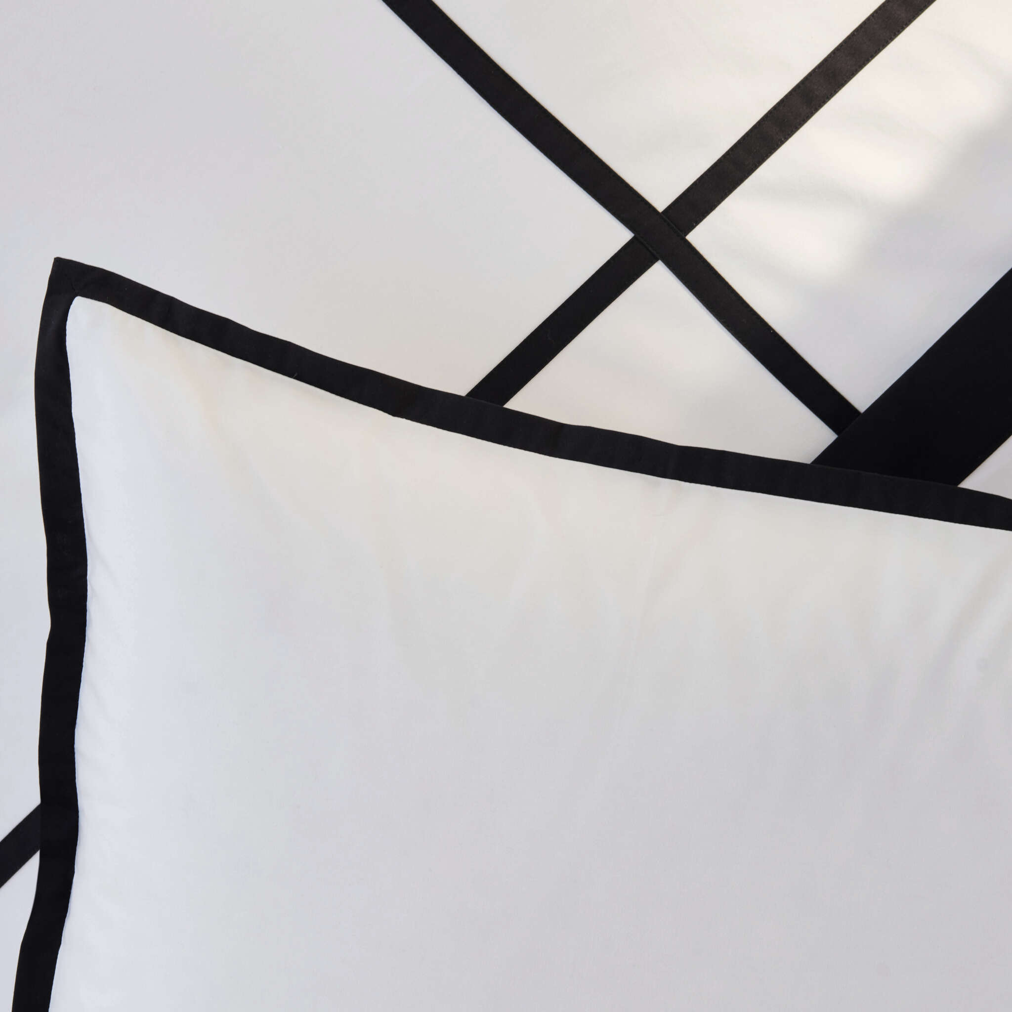 Crisp white percale bedding is expertly embellished with appliquéd banding. The banding is in Fusain, a silvery-black fossilized charcoal color. The Fusain colour, against the pure white, is very eye-catching and modern.
