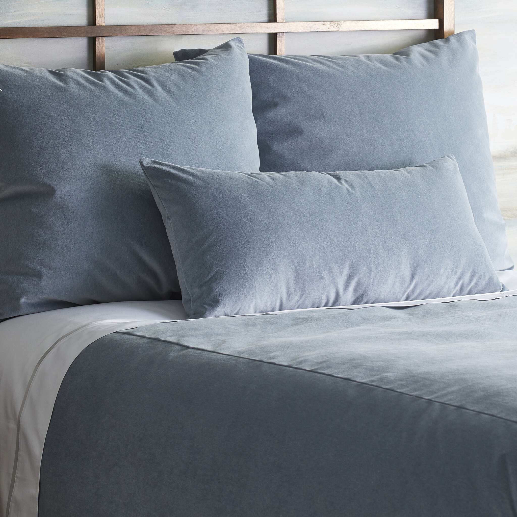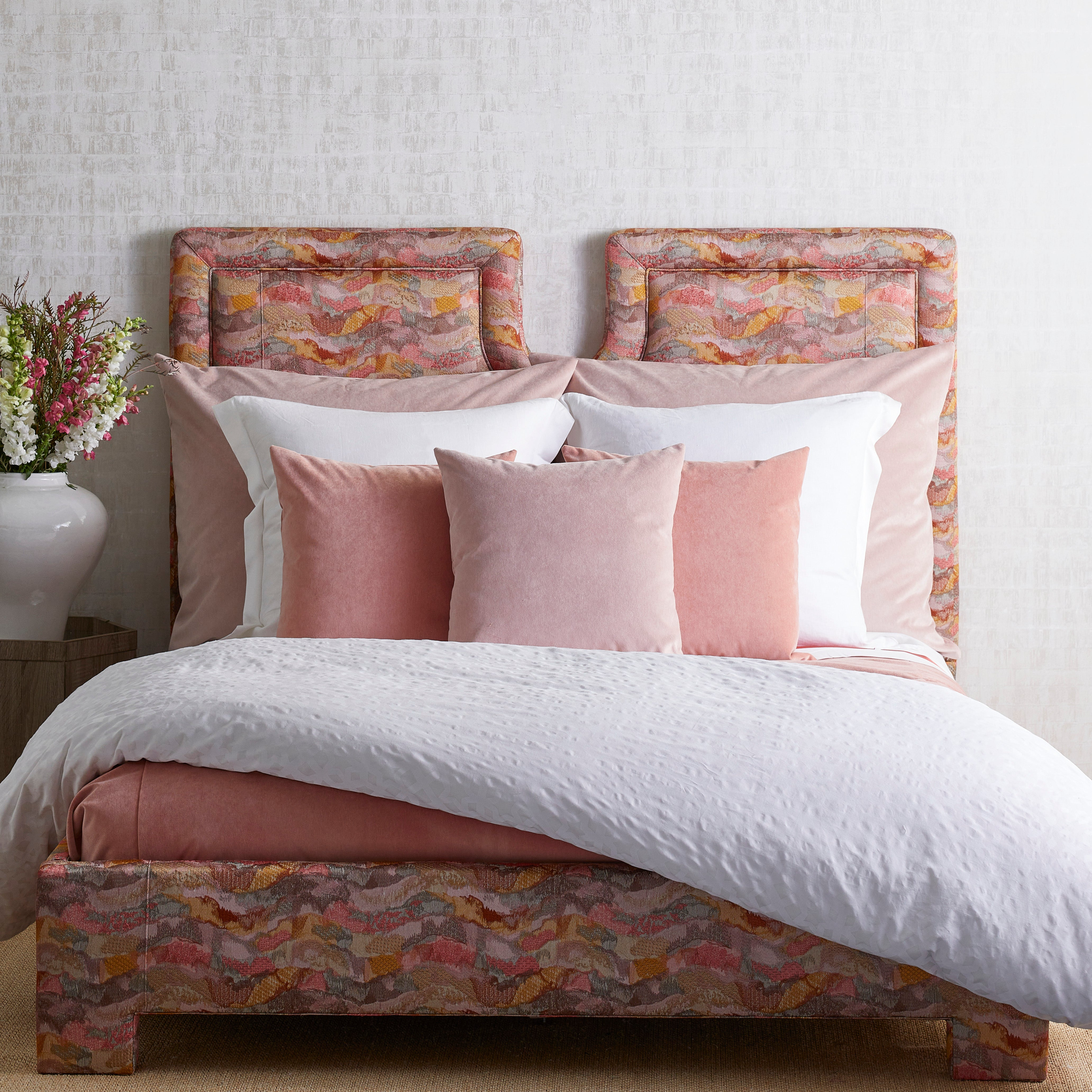 Inspired by the richness of soft pigments on plaster, our Fresco Velvet is made of 100% cotton. Completely washable, the tailored construction of the duvets, shams, and pillows in this collection makes great foundations for our accent pieces.