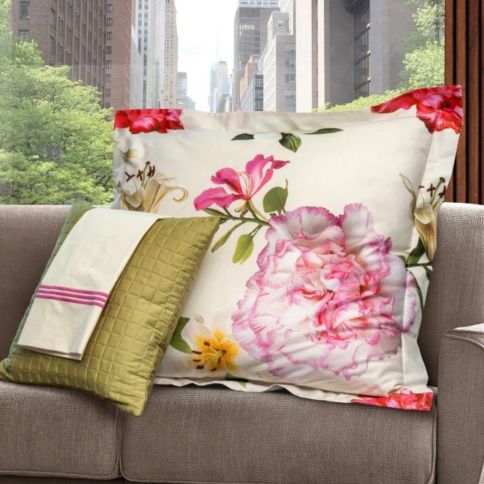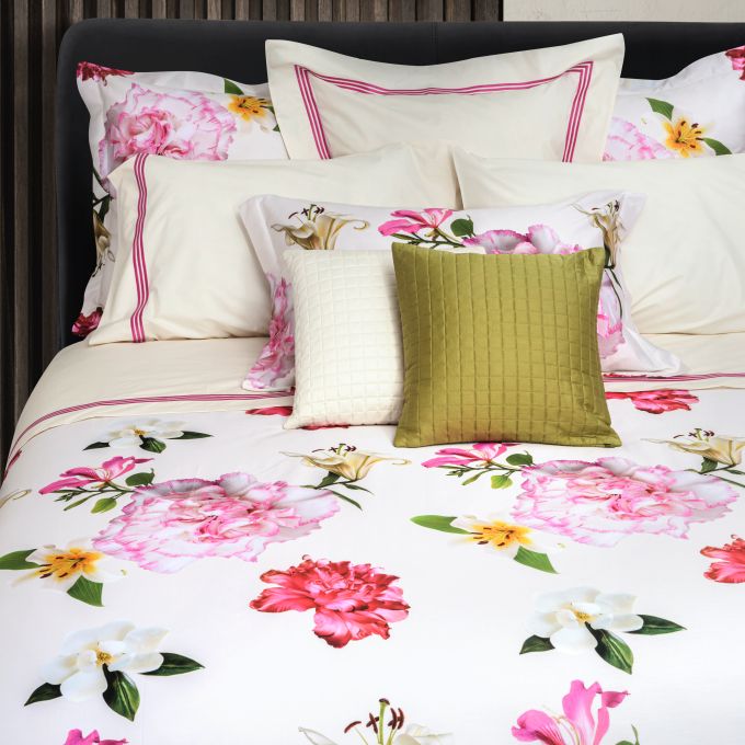 The beauty of flowers has always been the protagonist of the Signoria collections. In the Gioia collection, this explosion of vitality is even more enhanced by the size of the flowers. These bouquets of mixed flowers, with petals of a thousand shades, stand out on the precious cotton sateen, giving joy and elegance to the surrounding environment. The two color tones offered, brighter or softer, allow this design to coordinate with any décor.