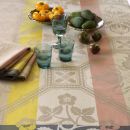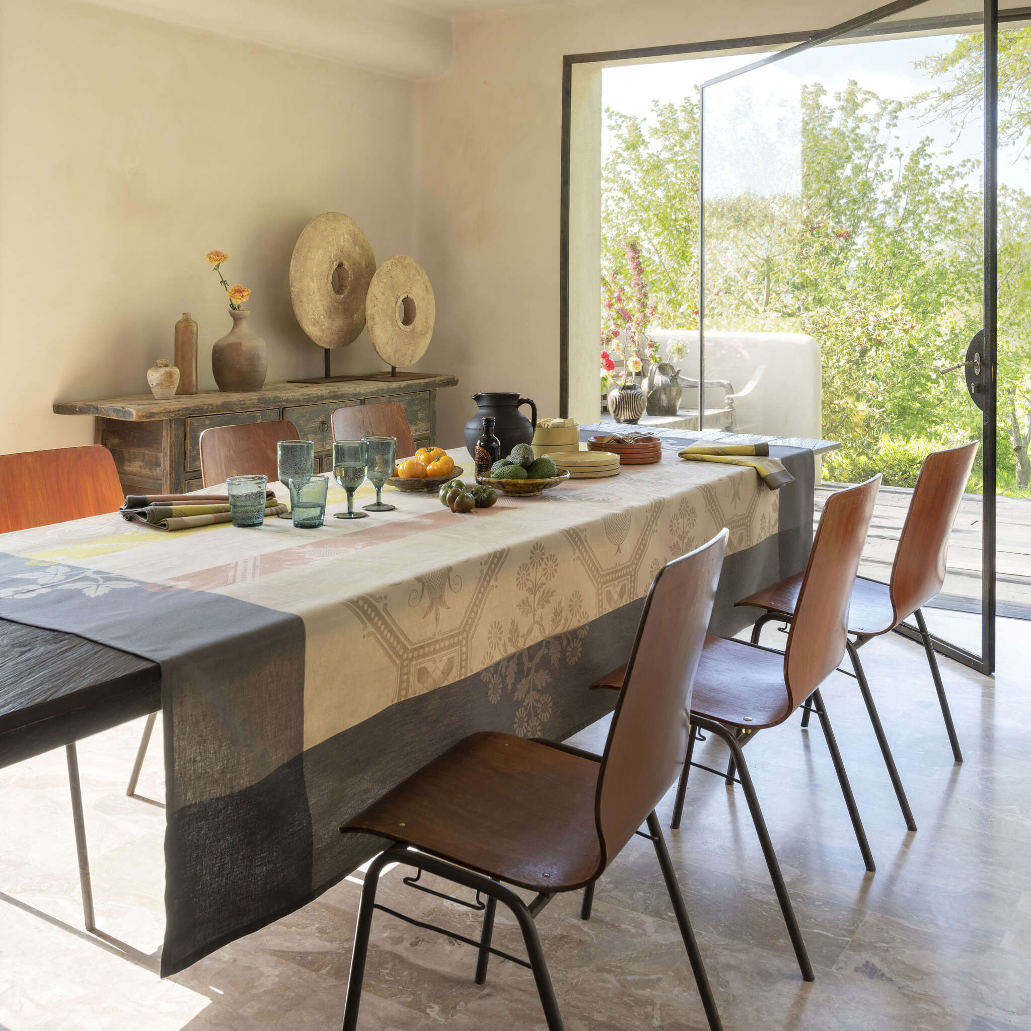 For your everyday family meals or convivial dinners, the Hacienda tablecloth will bring a warm and bright touch. Wrought iron designs, ornate facades and the geometry of Spanish floors are revisited and tied together with a bold play of stripes.
