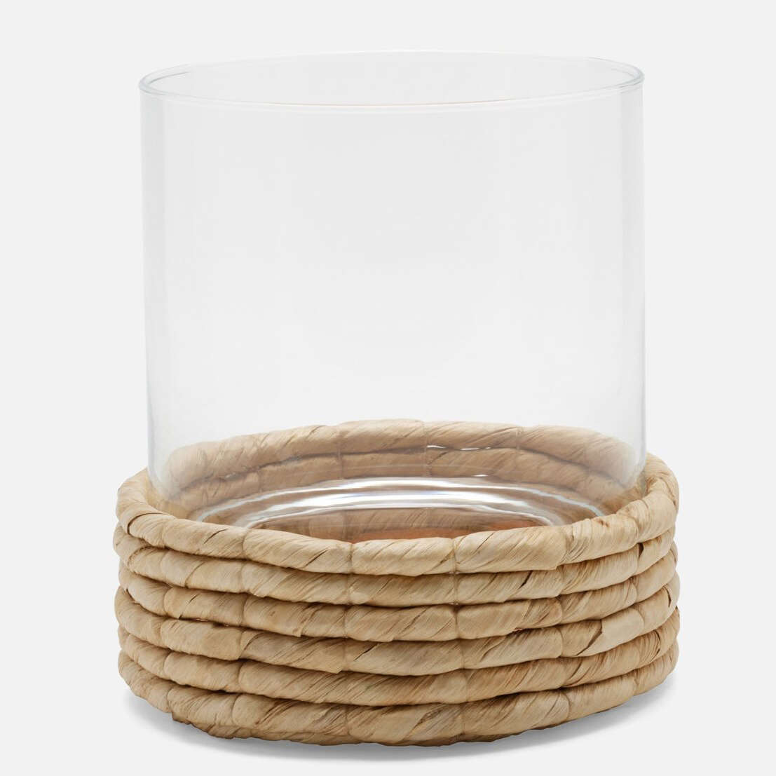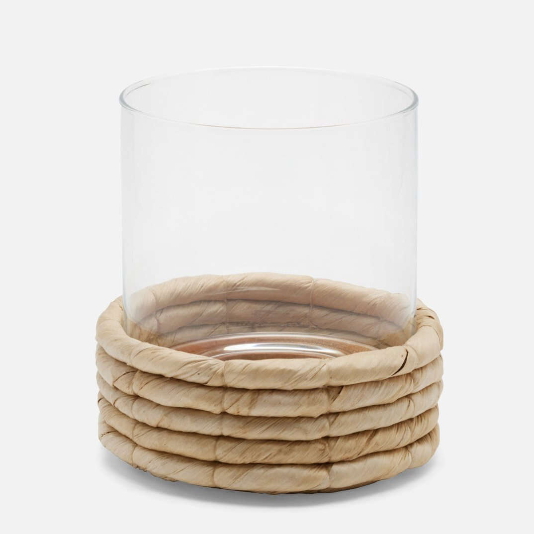 Lightness defines our Iona, a hurricane base built from woven layers of round twisted abaca and reinforced by a natural wooden ring, a feature that does double duty as support for a pillar candle and a stand for a clear glass shade.